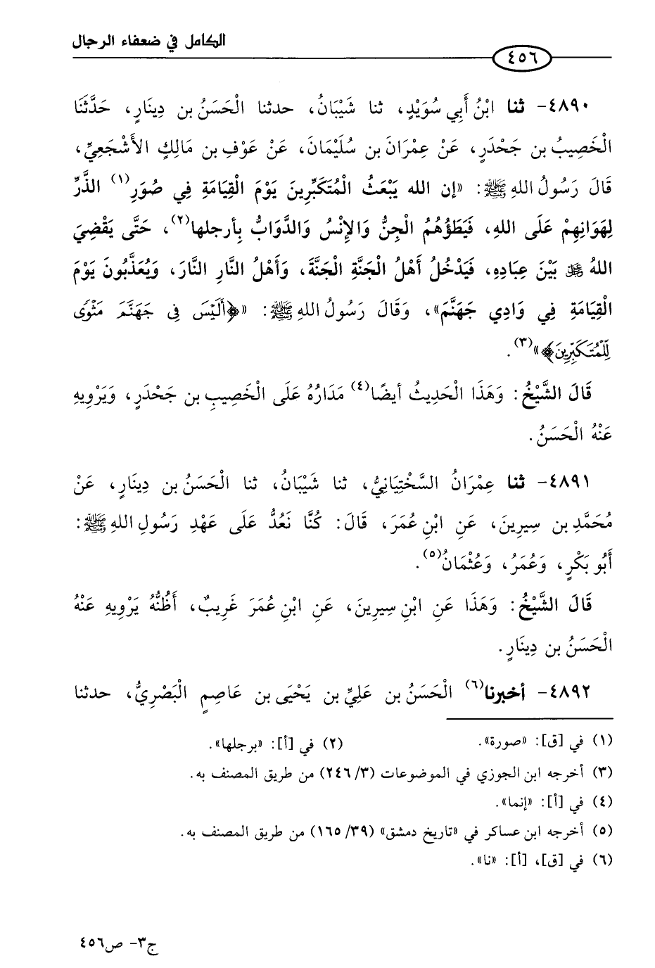 4891 - حَدثنا عمران السختياني، حَدثنا شيبان، حَدثنا الحسن بن دينار، عن مُحمد بن سِيرين، عن ابن عُمر قال: كُنا نعد على عهد رسول الله صَلى الله عَليه وسَلم: أَبو بكر وعمر وعثمان.