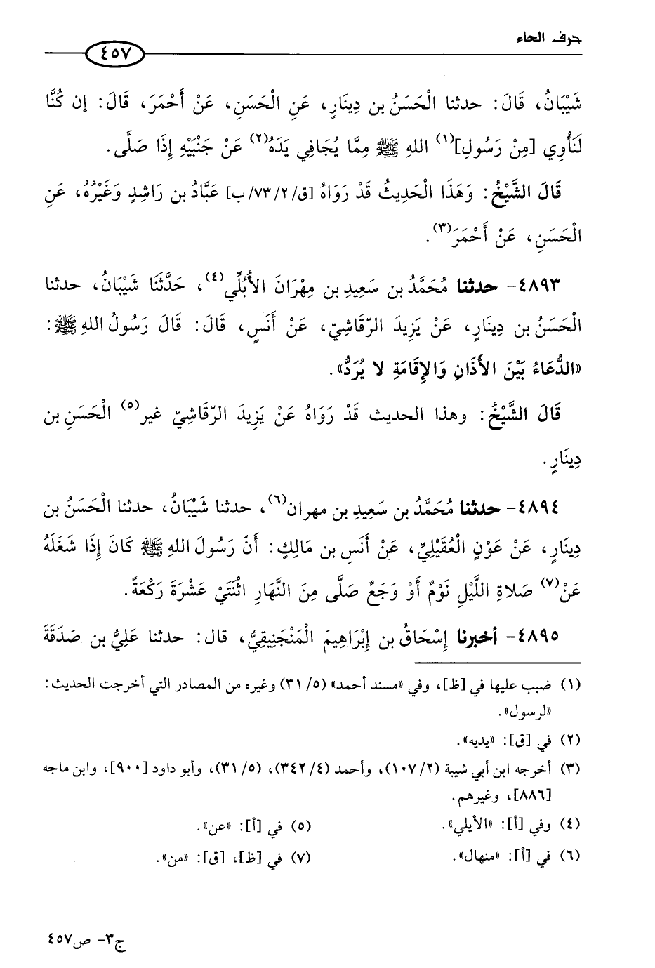 4893 - حَدثنا مُحمد بن سعيد بن مهران الأبلي، حَدثنا شيبان، حَدثنا الحسن بن دينار، عن يزيد الرقاشي، عن أَنَس، قال: قال رسول الله صَلى الله عَليه وسَلم: الدعاء بين الأذان والإقامة لا يرد.
