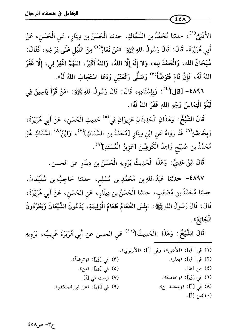 قال الشيخ: وهذان الحديثان عزيزان في حديث الحسن، عن أبي هريرة، وبخاصة قد رواه عن ابن دينار مُحمد بن السماك، وابن السماك هو مُحمد بن صبيح، زاهد الكوفيين، عزيز المسند.