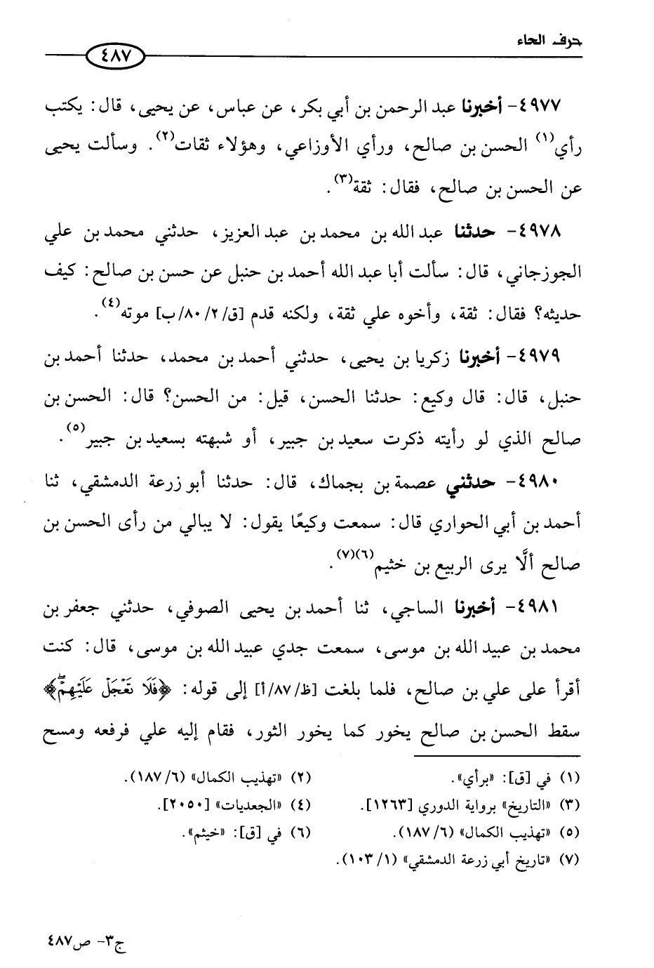 4981 - أخبرنا الساجي، حَدثنا أحمد بن يَحيى الصُّوفي، حَدَّثني جعفر بن مُحمد بن عُبيد الله بن موسى، سمعت جَدِّي عُبيد الله بن موسى قال: كنتُ أقرأ على علي بن صالح فلما بلغت إلى قوله: {فلا تعجل عليهم} سقط الحسن بن صالح يخور كما يخور الثور، فقام إليه عليٌّ فرفعه ومسح وجهه ورش عليه الماء وأسنده اليه.