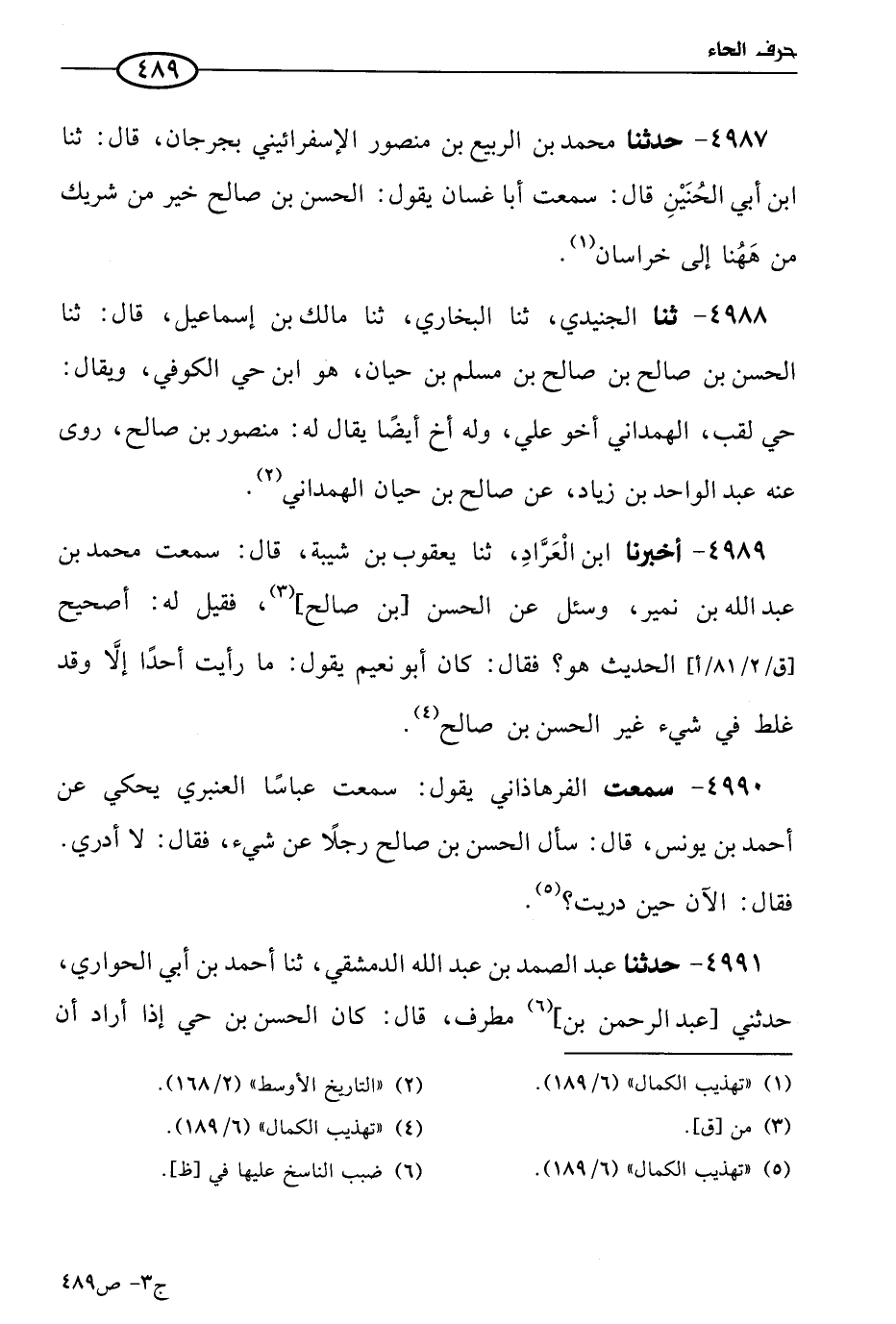 4989 - أخبرنا ابن العراد، حَدثنا يعقوب بن شيبة، قال: سمعتُ مُحمد بن عَبد الله بن نُمَير، وسُئِل عن الحسن بن صالح، فقيل له: أصحيح الحديث هو؟ فقال: كان أَبو نعيم يقول: ما رأيت أحدًا إلا وقد غلط في شيء غير الحسن بن صالح.