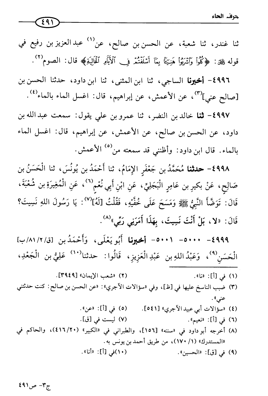 4996 - أخبرنا الساجي، حَدثنا ابن المثنى، حَدثنا ابن داود، حَدثنا الحسن بن صالح، عني، عن الأَعمَش، عن إبراهيم قال: اغسل الماء بالماء.