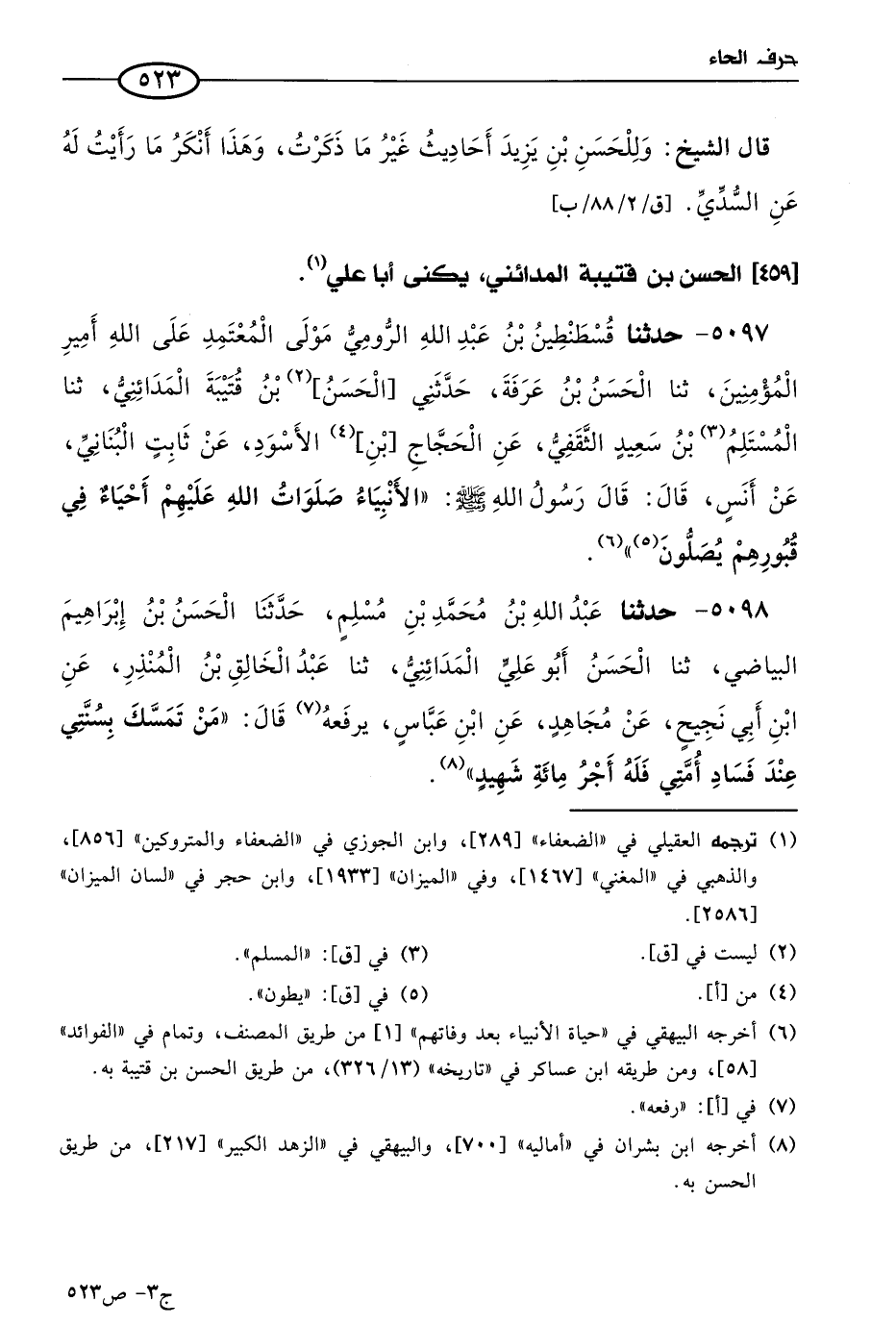 5097 - حَدثنا قسطنطين بن عَبد الله الرومي، مولى المعتمد على الله أمير المؤمنين، حَدثنا الحسن بن عرفة، حَدَّثني الحسن بن قتيبة المدائني، حَدثنا المستلم بن سعيد الثقفي، عن الحجاج بن الأسود، عن ثابت البناني، عن أَنَس، قال: قال رسول الله صَلى الله عَليه وسَلم: الأنبياء صلوات الله عليهم أحياء في قبورهم يصلون.