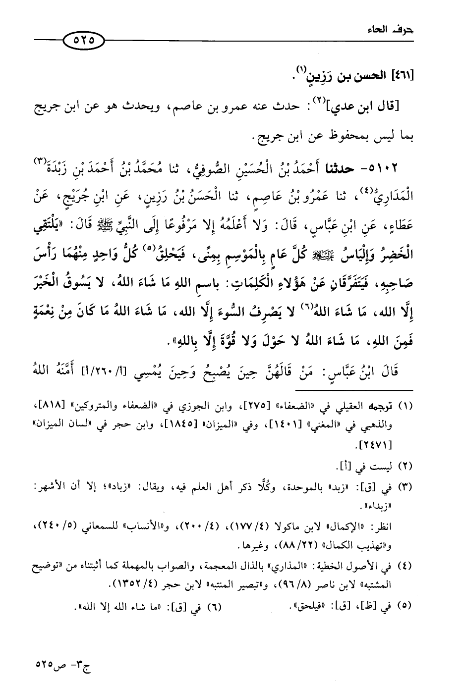 5102 - حَدثنا أحمد بن الحسين الصُّوفي، حَدثنا مُحمد بن أحمد بن زبدة المداري، حَدثنا عَمرو بن عاصم، حَدثنا الحسن بن رزين، عن ابن جُرَيج، عن عطاء، عن ابن عباس قال، ولا أعلمه إلا مرفوعا إلى النبي صَلى الله عَليه وسَلم، قال: يلتقي الخضر وإلياس عليهما السلام، كل عام بالموسم بمنى، فيحلق كل واحد منهما رأس صاحبه، فيتفرقان عن هؤلاء الكلمات: بسم الله، ما شاء الله، لا يسوق الخير إلا الله، ما شاء الله، لا يصرف السوء إلا الله، ما شاء الله، ما كان من نعمة فمن الله، ما شاء الله، لا حول ولا قوة إلا بالله. قال ابن عباس: من قالهن حين يصبح وحين يمسي أمَّنَهُ الله عَزّ وجَلّ من الغرق والحرق والشرق، وأحسبه قال: ومن الشيطان والسلطان، ومن الحية والعقرب.