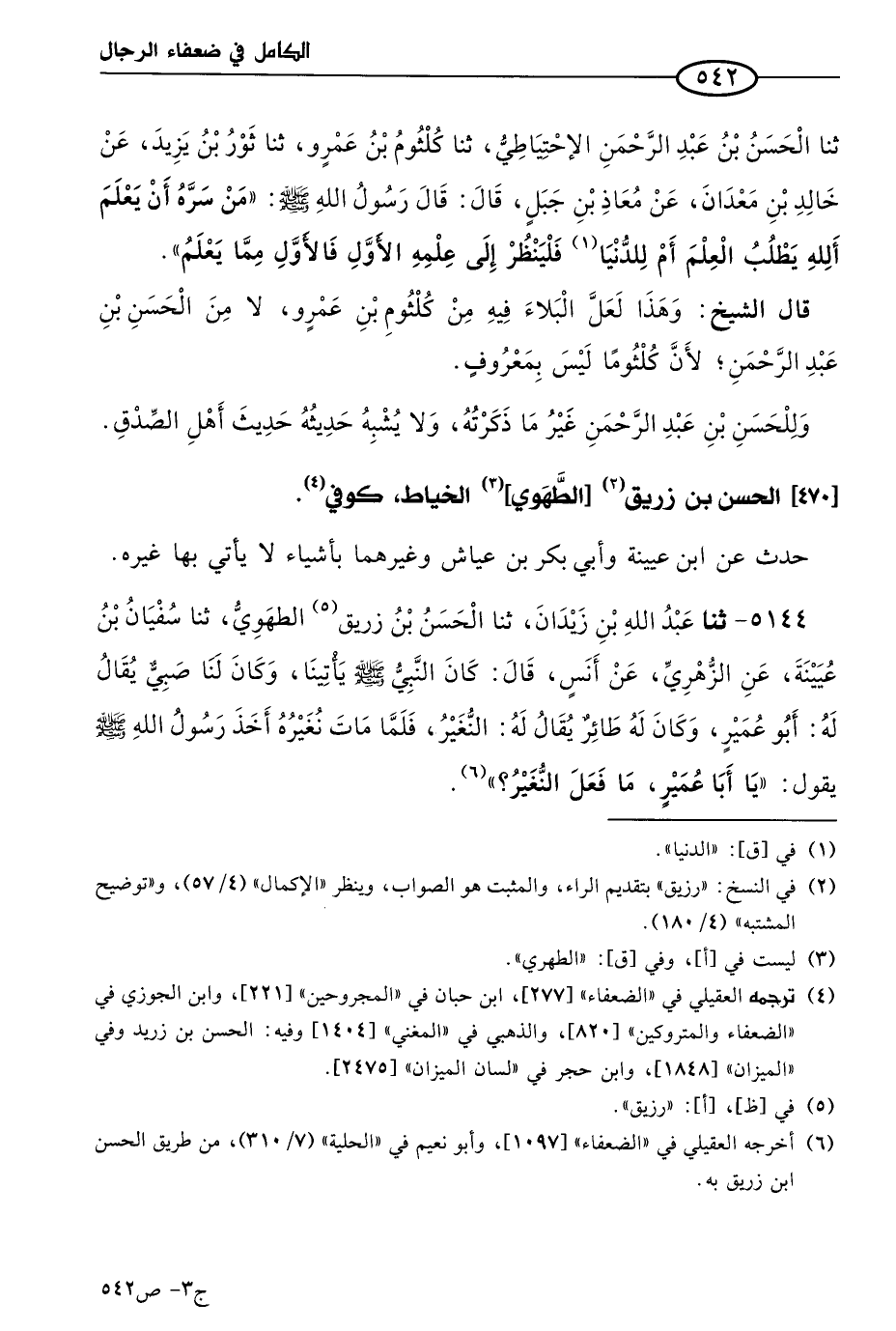 5144 - حَدثنا عَبد الله بن زيدان، حَدثنا الحسن بن زريق الطهوي، حَدثنا سفيان بن عُيَينة، عن الزُّهْري، عن أَنَس، قال: كان النبي صَلى الله عَليه وسلم يأتينا، وكان لنا صبي يُقال له: أَبو عُمَير، وكان له طائر، يُقال له: النغير، فلما مات نغيره، أخذ رسول الله صَلى الله عَليه وسَلم يقول: يا أبا عُمَير، ما فعل النغير؟.