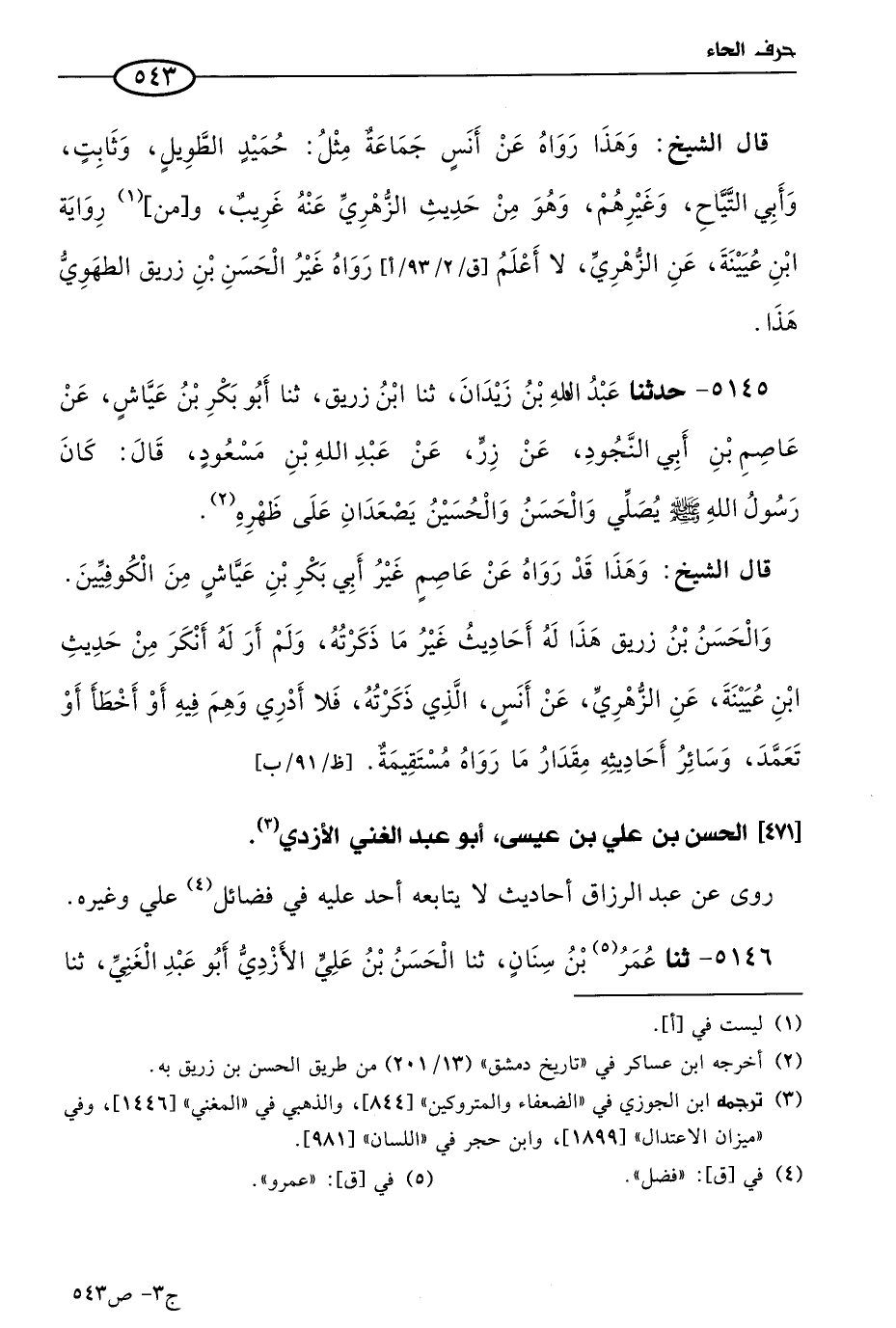 5145 - حَدثنا عَبد الله بن زيدان، حَدثنا ابن زريق، حَدثنا أَبو بكر بن عياش، عن عاصم بن أبي النجود، عن زر، عن عَبد الله بن مسعود، قال: كان رسول الله صَلى الله عَليه وسَلم يصلي والحسن والحُسَين يصعدان على ظهره.