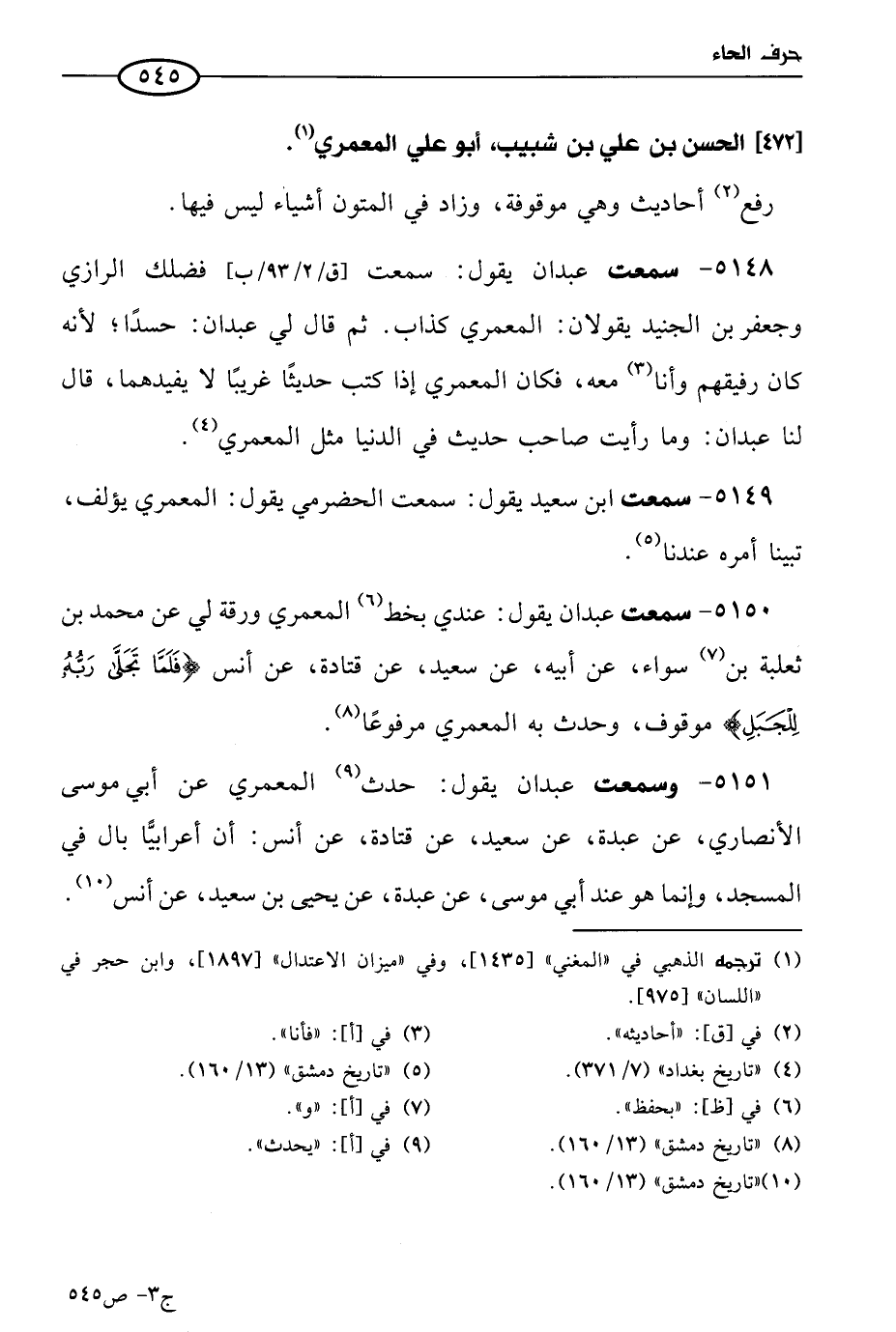 5148 - سمعت عبدان يقول: سَمعتُ فضلك الرازي، وجعفر بن الجنيد يقولان: المعمري كذاب، ثم قال لي عبدان: حسدا، لأنه كان رفيقهم، وأنا معه، فكان المعمري إذا كتب حديثًا غريبا لا يفيدهما قال لنا عبدان: وما رأيت صاحب حديث في الدنيا مثل المعمري.