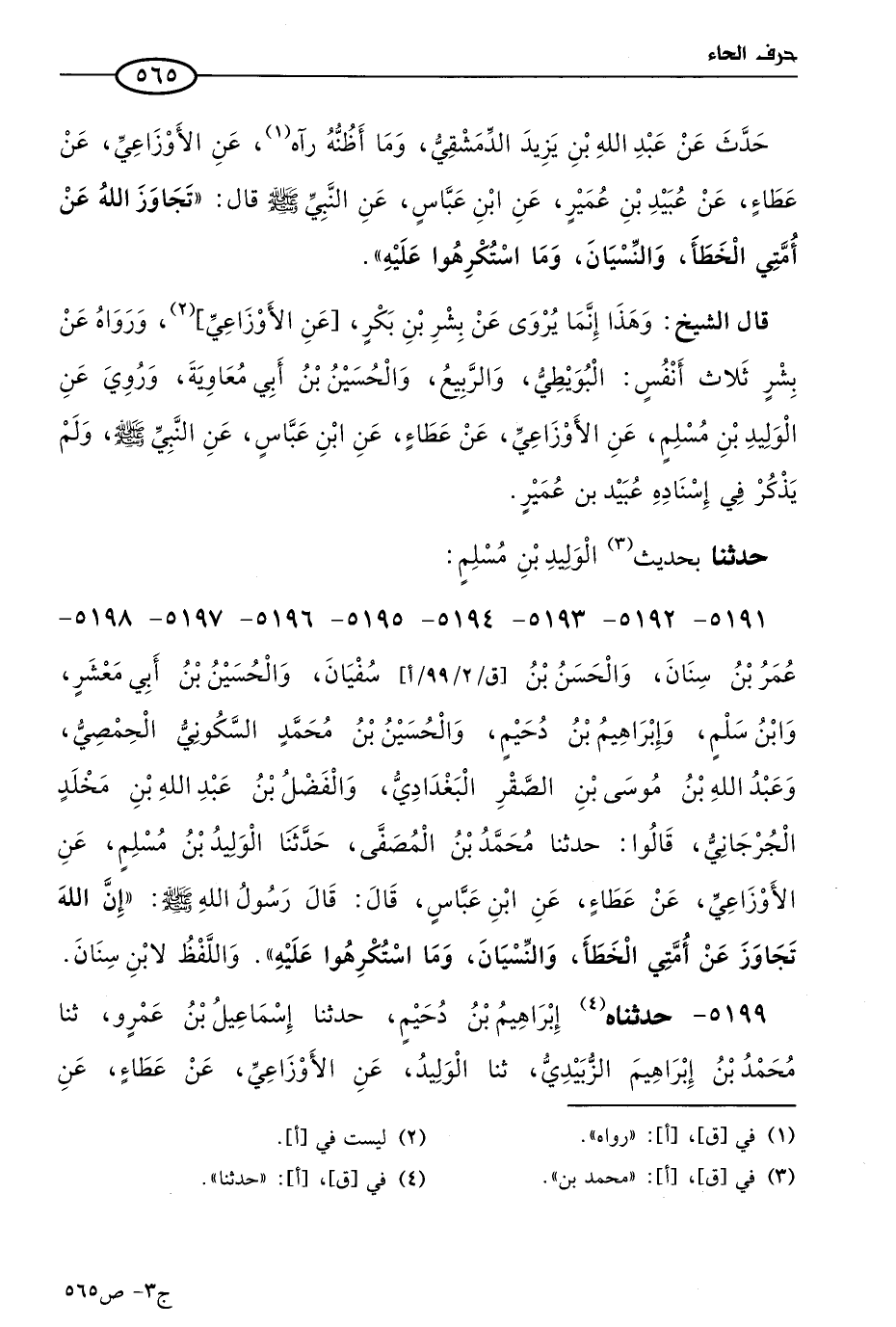 5191 - 5192 - 5193 - 5194 - 5195 - 5196 - 5197 - 5198 - عُمر بن سنان، والحسن بن سفيان، والحُسَين بن أبي معشر، وابن سلم، وإبراهيم بن دحيم، والحُسَين بن مُحمد السكوني الحِمصِي، وعَبد الله بن موسى بن الصقر البغدادي، والفضل بن عَبد الله بن مخلد الجرجاني، قالوا: حَدثنا مُحمد بن المصفى، حَدثنا الوليد بن مسلم، عن الأَوزاعي عن عطاء، عن ابن عباس، قال: قال رسول الله صَلى الله عَليه وسَلم: إِنّ الله تجاوز عن أُمَّتِي الخطأ والنسيان وما استكرهوا عليه. واللفظ لابن سنان.