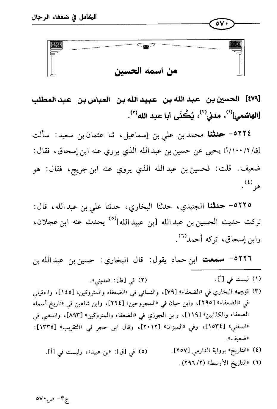 5225 - حَدثنا الجنيدي، حَدثنا البُخاري، حَدثنا علي بن عَبد الله قال: تركت حديث الحسين بن عَبد الله بن عُبيد الله، يحدث عنه ابن عجلان، وابن إسحاق، تركه أحمد.