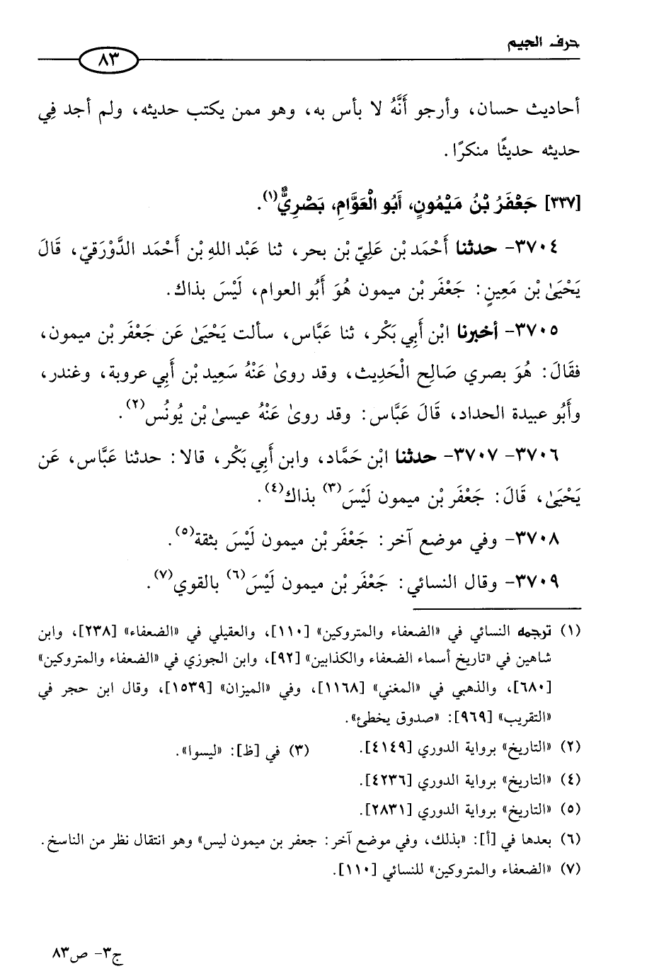 3706 - 3707 - حَدثنا ابن حماد، وابن أبي بكر، قالا: حَدثنا عباس، عن يَحيى، قال: جعفر بن ميمون ليس بذاك.
