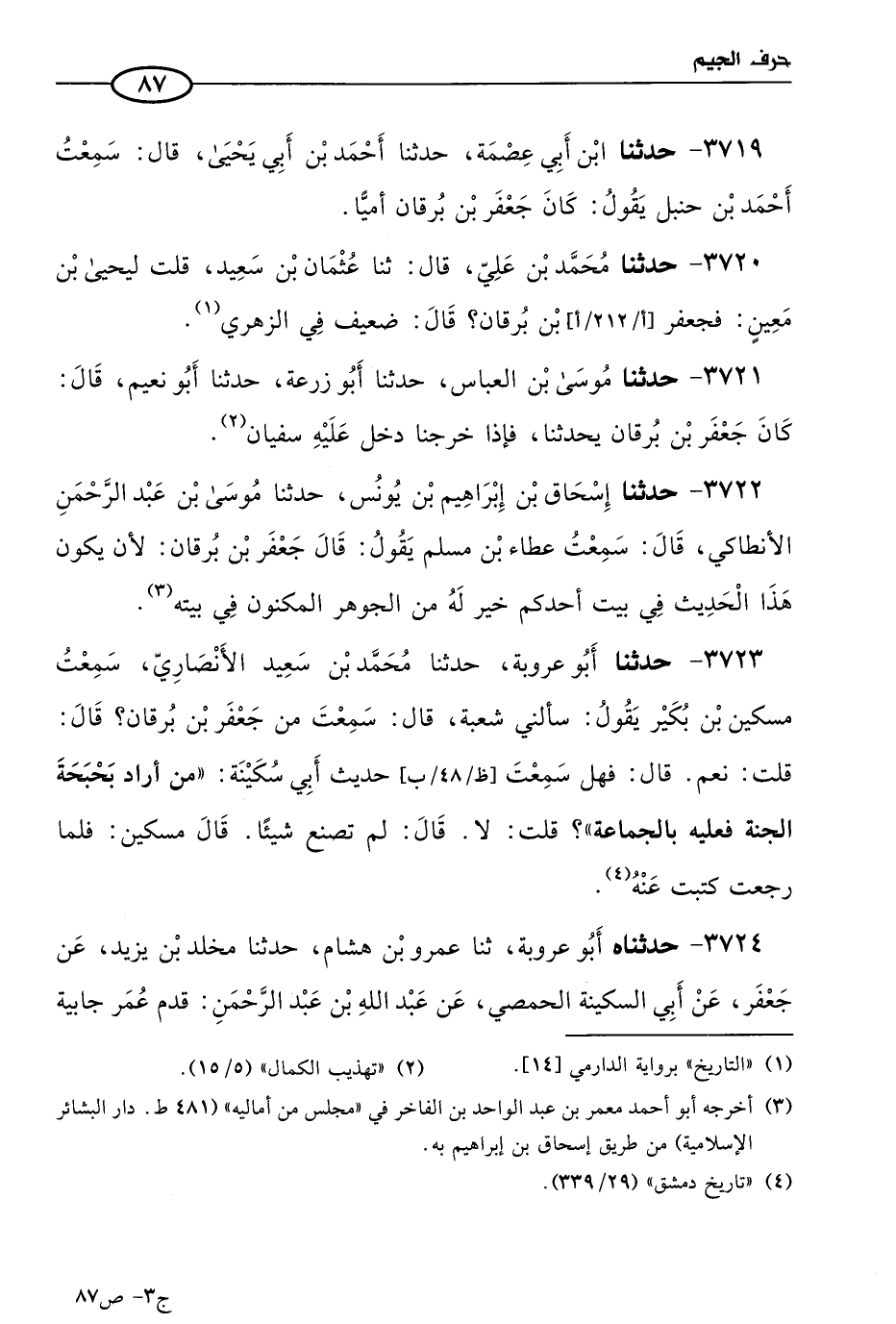 3721 - حَدثنا موسى بن العباس، حَدثنا أبُو زُرْعَةَ، حَدثنا أَبو نعيم، قال: كان جعفر بن برقان يحدثنا، فإذا خرجنا دخل عليه سفيان.