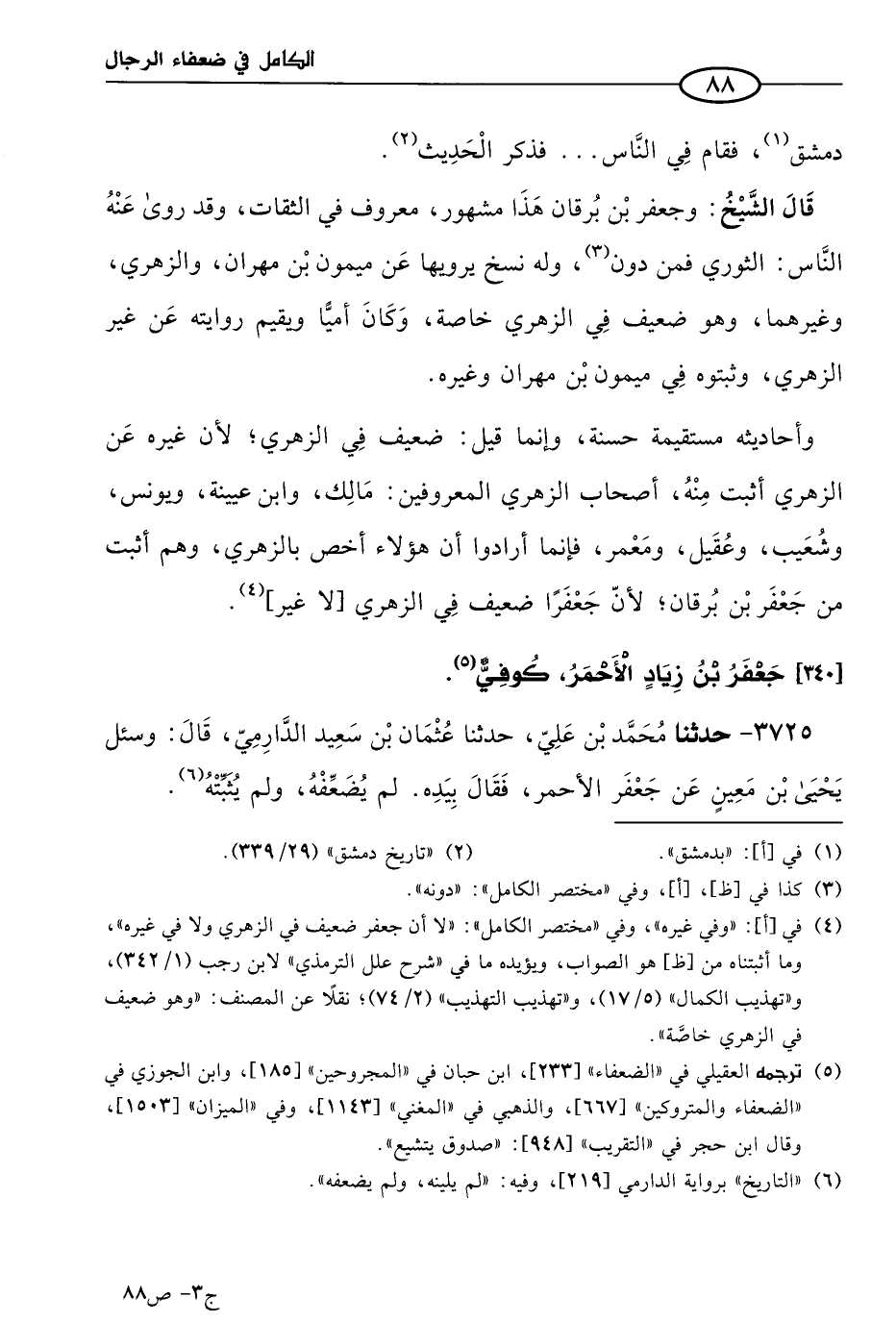 قال الشيخ: وجعفر بن برقان هذا مشهور معروف في الثقات وقد روى عنه الناس؛ الثَّوري فمن دون، وله نسخ يرويها عن ميمون بن مهران والزهري وغيرهما، وهو ضعيف في الزُّهْري خاصة وكان أُميا، ويقيم روايته عن غير الزُّهْري، وثبتوه في ميمون بن مهران وغيره.
