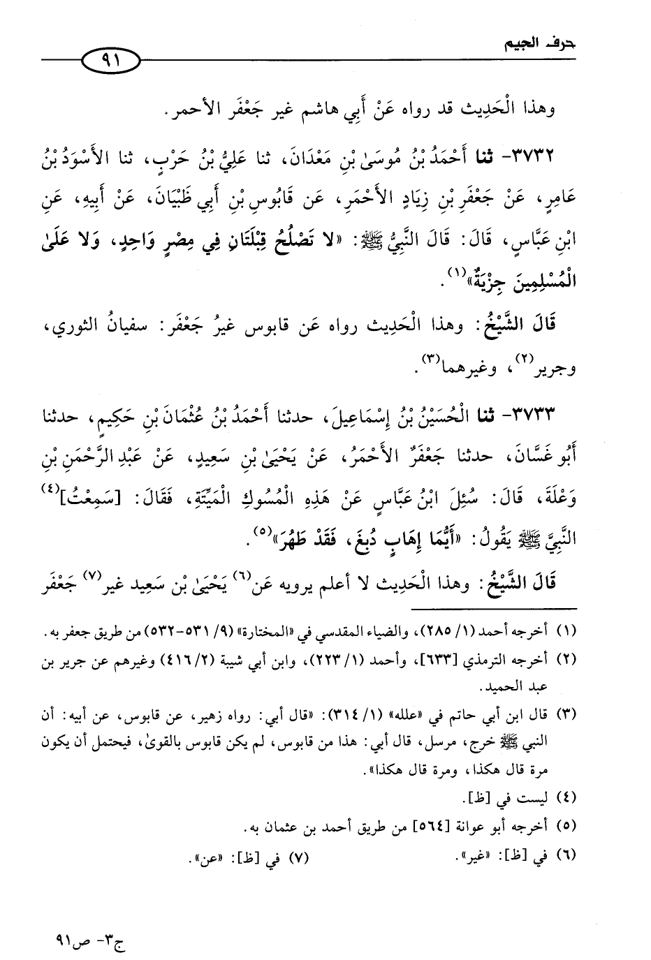 3733 - حَدثنا الحسين بن إسماعيل، حَدثنا أحمد بن عثمان بن حكيم، حَدثنا أَبو غسان، حَدثنا جعفر الأحمر، عن يَحيى بن سعيد، عن عَبد الرحمن بن وعلة قال: سُئِل ابن عباس، عن هذه المسوك الميتة، فقال: سمعتُ النبي صَلى الله عَليه وسَلم يقول: أيما إهاب دبغ فقد طهر.