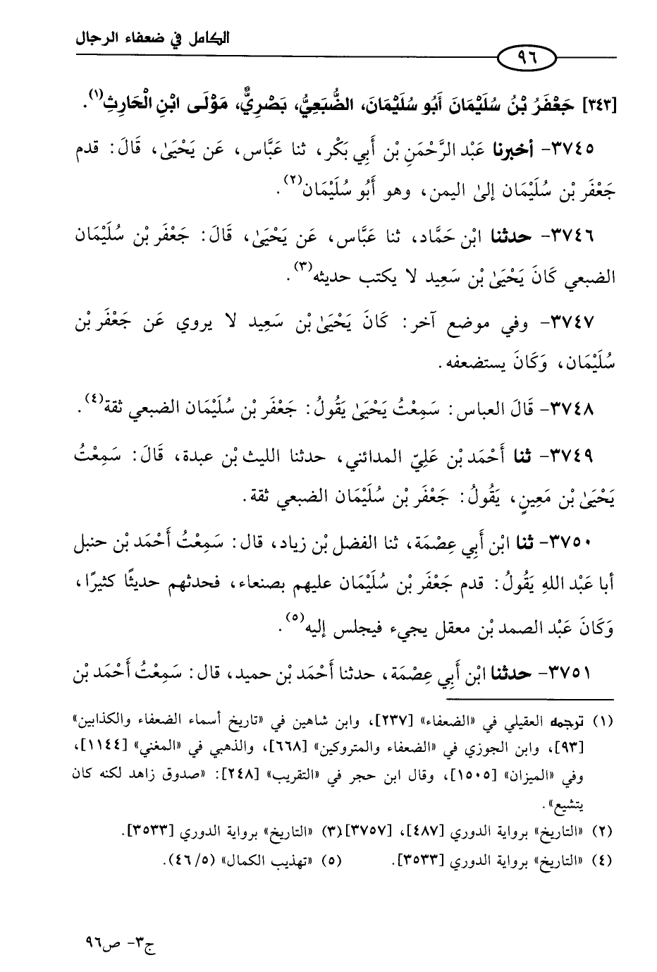 3750 - حَدثنا ابن أبي عصمة، حَدثنا الفضل بن زياد، قال: سمعتُ أحمد بن حنبل، أبا الله يقول: قدم جعفر بن سليمان عليهم بصنعاء فحدثهم حديثًا كثيرا، وكان عَبد الصمد بن معقل يجيء فيجلس إليه.