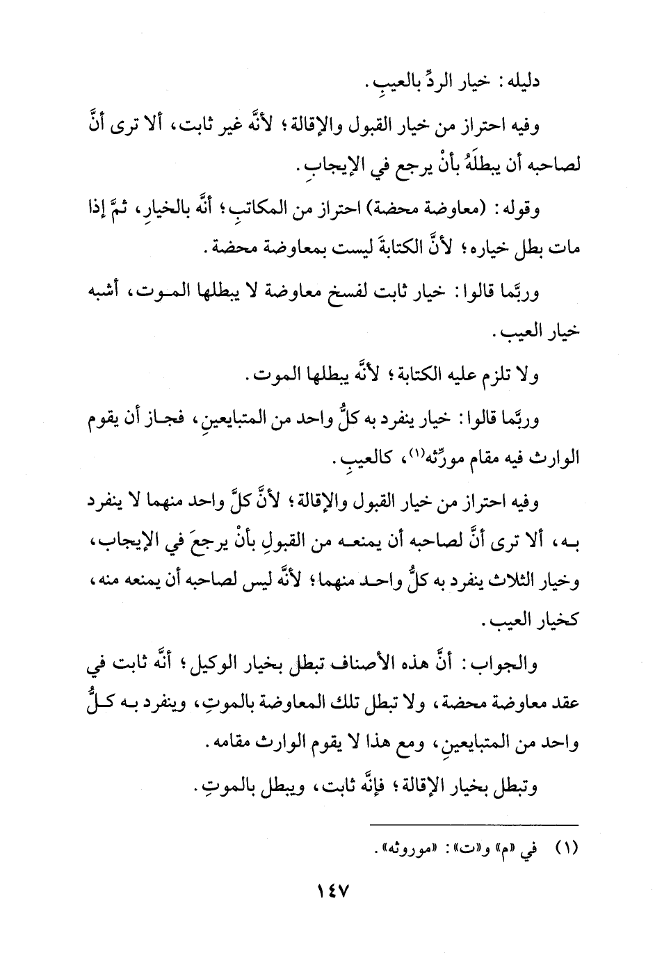 والجواب: أن هذه الأصناف تبطل بخيار الوكيل؛ أنه ثابت في عقد معاوضة محضة، ولا تبطل تلك المعاوضة بالموت، وينفرد به كل واحد من المتبايعين، ومع هذا لا يقوم الوارث مقامه.