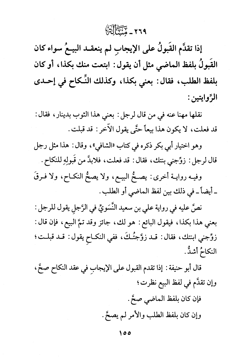 إذا تقدم القبول على الإيجاب لم ينعقد البيع سواء كان القبول بلفظ الماضي مثل أن يقول: ابتعت منك بكذا، أو كان بلفظ الطلب، فقال: بعني بكذا، وكذلك النكاح في إحدى الروايتين: