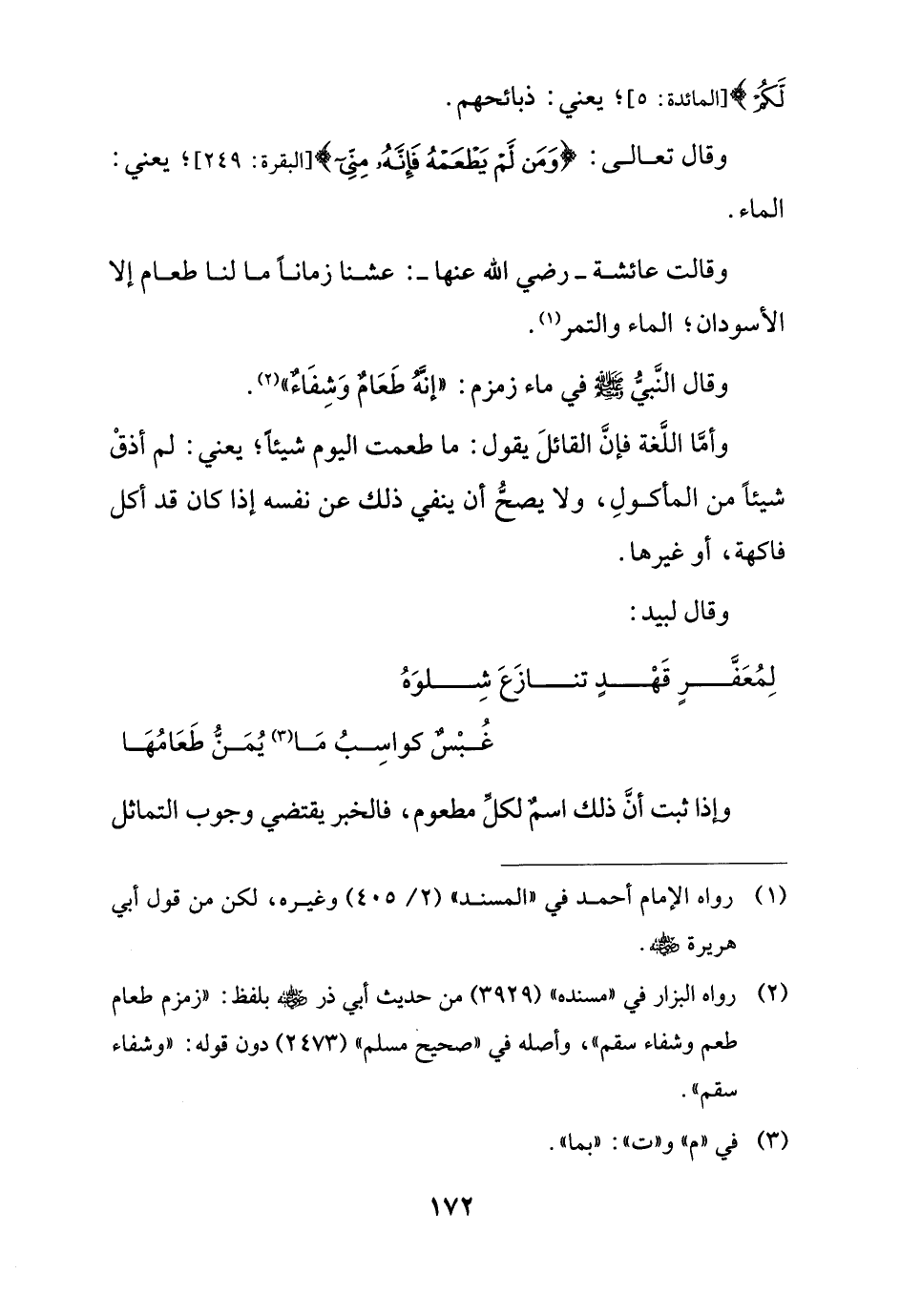 وقال تعالى: {وَمَنْ لَمْ يَطْعَمْهُ فَإِنَّهُ مِنِّي} [البقرة: 249]؛ يعني: الماء.