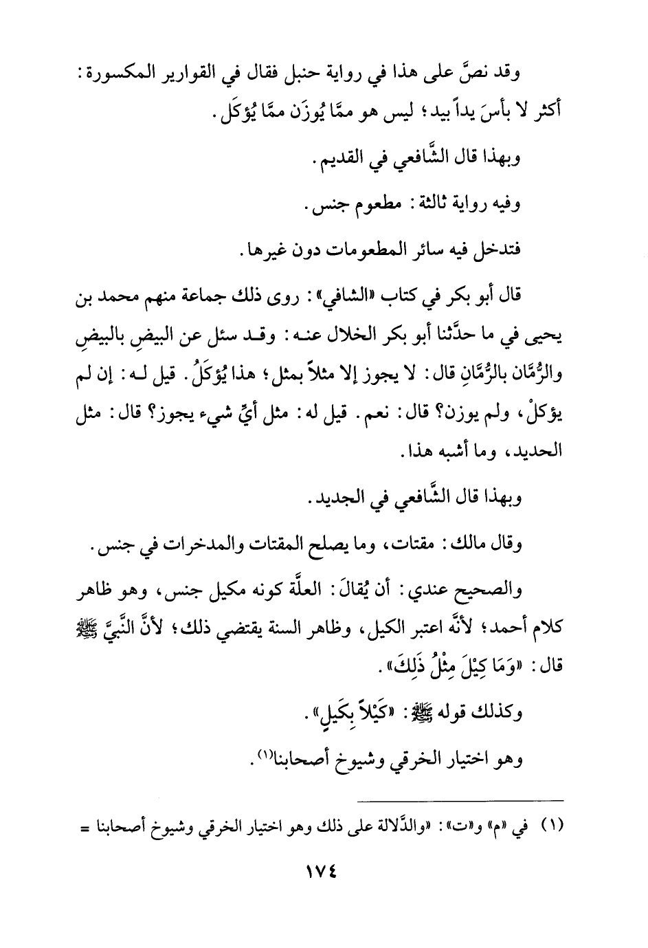 قال أبو بكر في كتاب «الشافي»: روى ذلك جماعة منهم محمد بن يحيى في ما حدثنا أبو بكر الخلال عنه: وقد سئل عن البيض بالبيض والرمان بالرمان قال: لا يجوز إلا مثلًا بمثل؛ هذا يؤكل. قيل له: إن لم يؤكل، ولم يوزن؟ قال: نعم. قيل له: مثل أي شيء يجوز؟ قال: مثل الحديد، وما أشبه هذا.