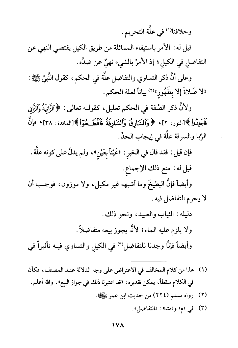 وعلى أن ذكر التساوي والتفاضل علة في الحكم، كقول النبي - صلى الله عليه وسلم -: (لا صلاة إلا بطهورٍ) بيانًا لعلة الحكم.