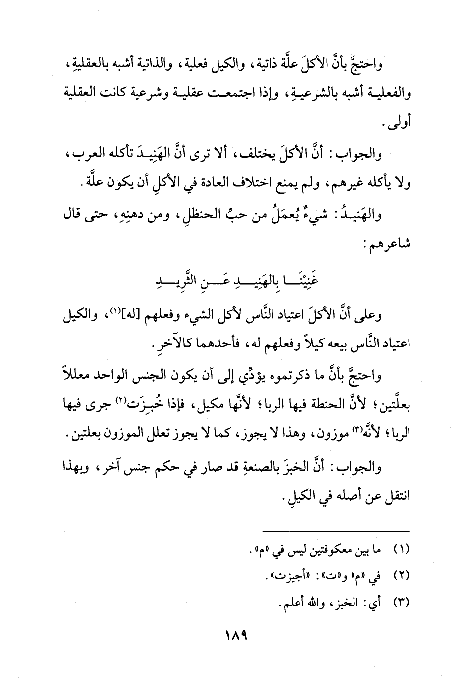 وعلى أن الأكل اعتياد الناس لأكل الشيء وفعلهم [له]، والكيل اعتياد الناس بيعه كيلًا وفعلهم له، فأحدهما كالآخر.