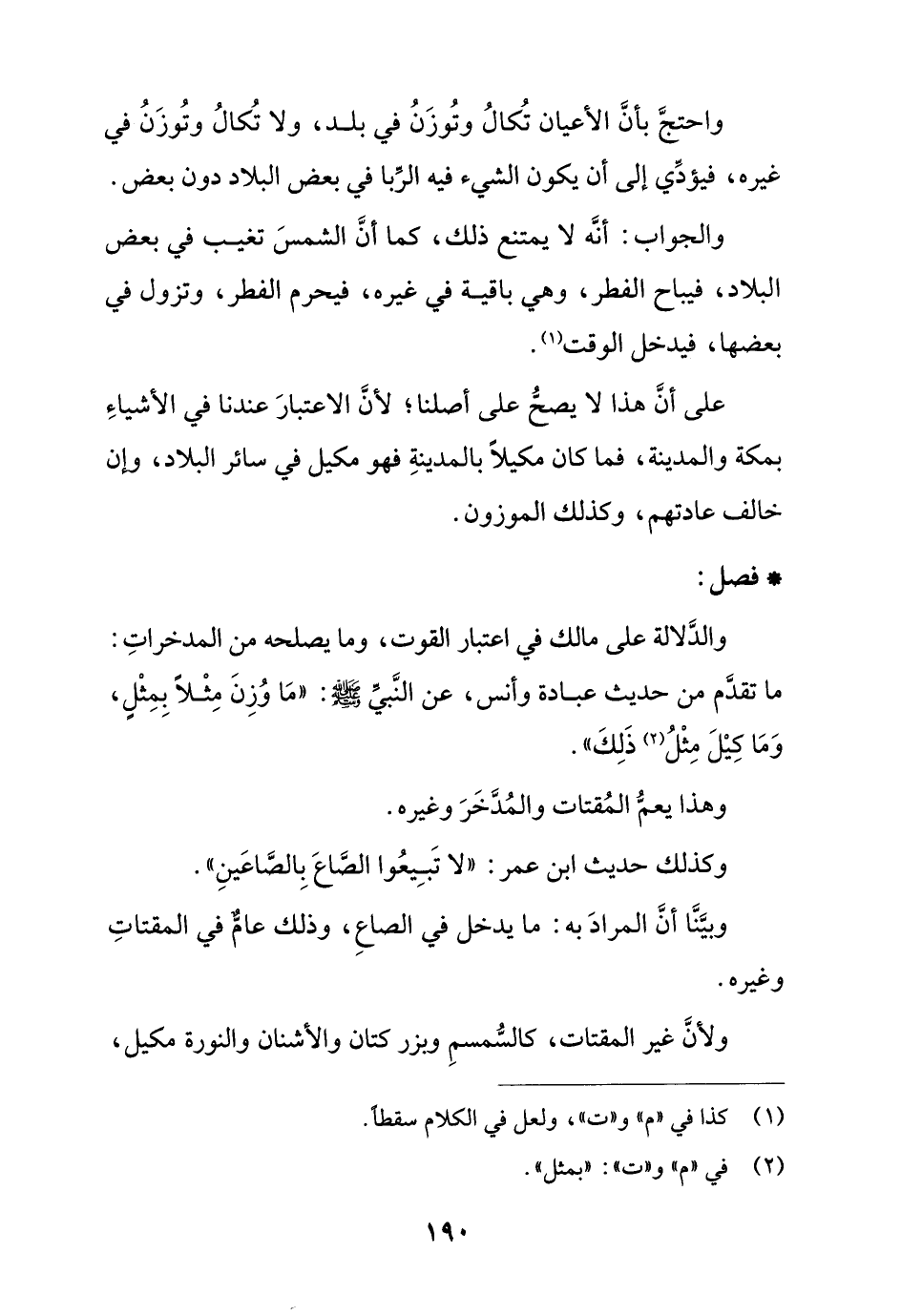 واحتج بأن الأعيان تكال وتوزن في بلد، ولا تكال وتوزن في غيره، فيؤدي إلى أن يكون الشيء فيه الربا في بعض البلاد دون بعض.