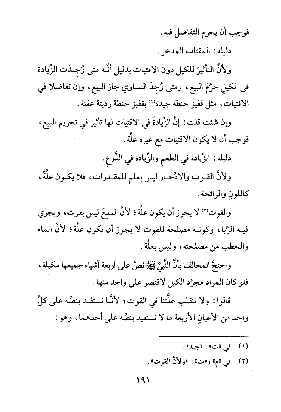 ولأن التأثير للكيل دون الاقتيات بدليل أنه متى وجدت الزيادة في الكيل حرم البيع، ومتى وجد التساوي جاز البيع، وإن تفاضلا في الاقتيات، مثل قفيز حنطة جيدة بقفيز حنطة رديئة عفنة.