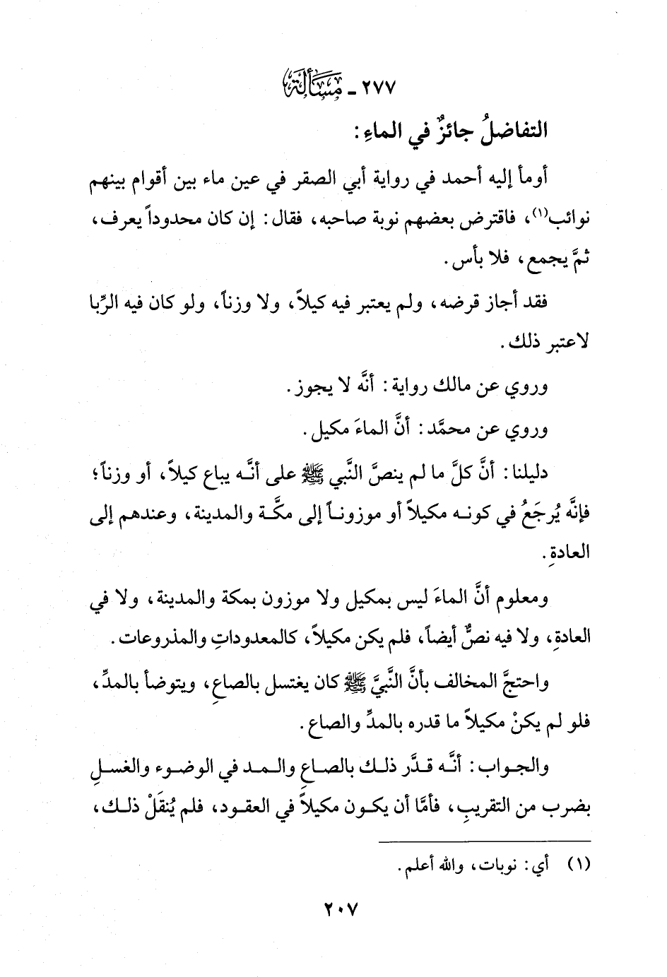 ومعلوم أن الماء ليس بمكيل ولا موزون بمكة والمدينة, ولا في العادة, ولا فيه نص أيضًا, فلم يكن مكيلًا, كالمعدودات والمذروعات.