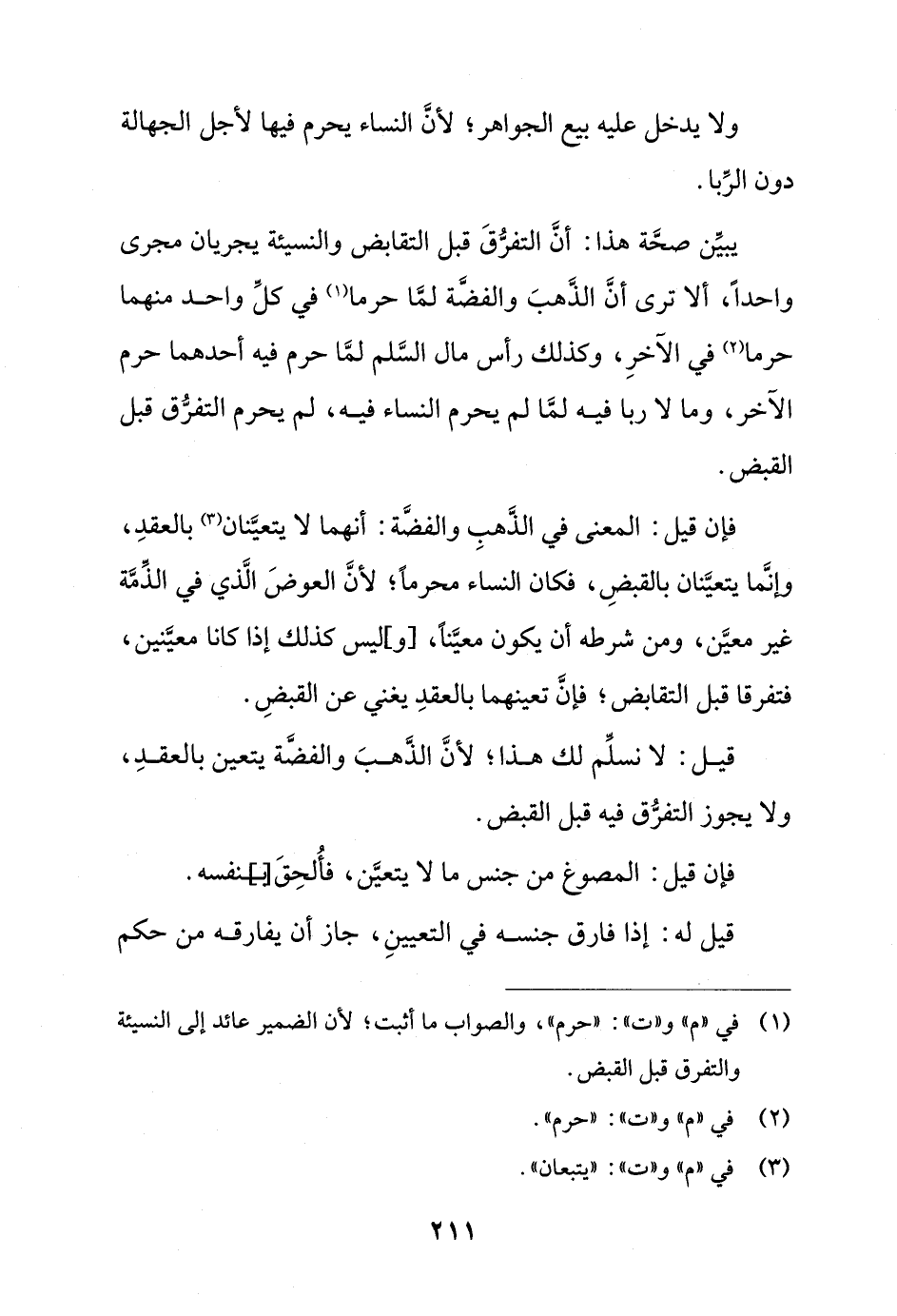 يبين صحة هذا: أن التفرق قبل التقابض والنسيئة يجريان مجرى واحدًا, ألا ترى أن الذهب والفضة لما حرما في كل واحد منهما حرما في الآخر, وكذلك رأس مال السلم لما حرم فيه أحدهما حرم الآخر, وما لا ربا فيه لما لم يحرم النساء فيه, لم يحرم التفرق قبل القبض.
