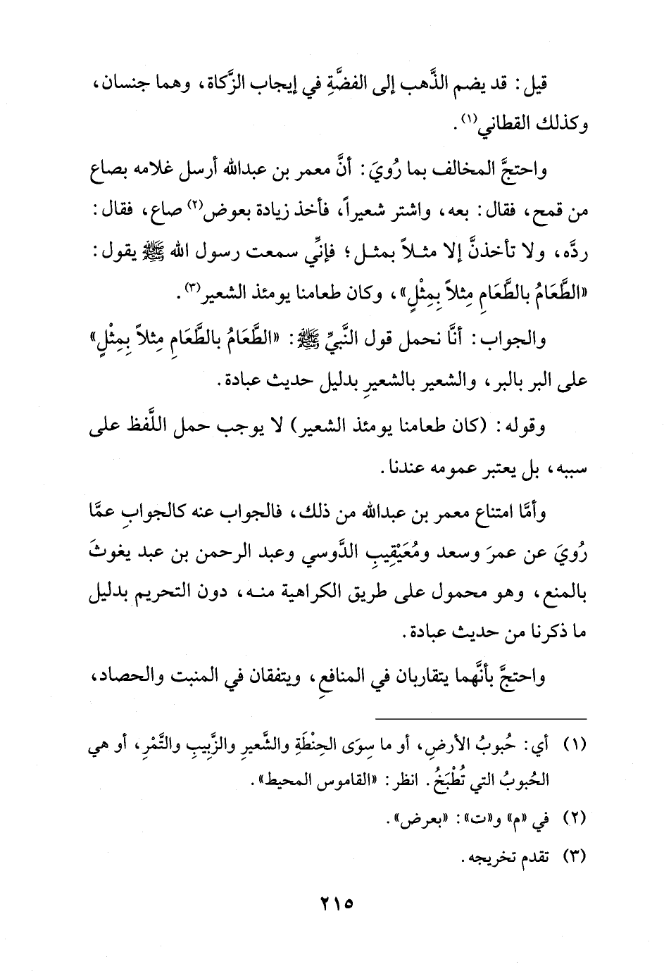 وأما امتناع معمر بن عبد الله من ذلك, فالجواب عنه كالجواب عما روي عن عمر وسعد ومعيقيب الدوسي وعبد الرحمن بن عبد يغوث بالمنع, وهو محمول على طريق الكراهية منه, دون التحريم بدليل ما ذكرنا من حديث عبادة.