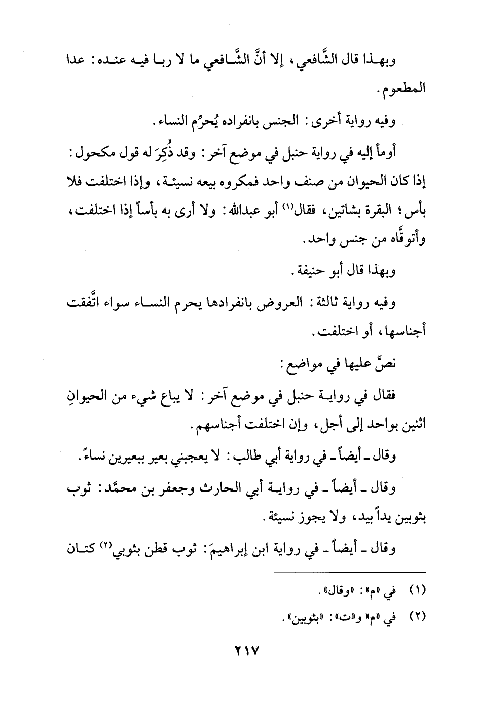 أومأ إليه في رواية حنبل في موضع آخر: وقد ذكر له قول مكحول: إذا كان الحيوان من صنف واحد فمكروه بيعه نسيئة, وإذا اختلفت فلا بأس؛ البقرة بشاتين, فقال أبو عبد الله: ولا أرى به بأسًا إذا اختلفت, وأتوقاه من جنس واحد.