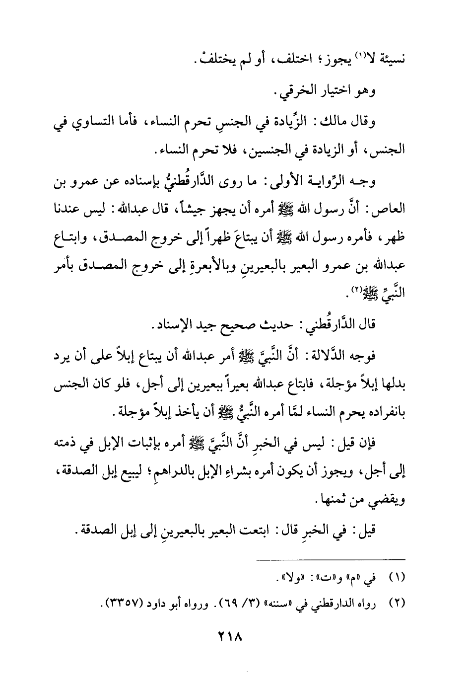 وجه الرواية الأولى: ما روى الدارقطني بإسناده عن عمرو بن العاص: أن الرسول - صلى الله عليه وسلم - أمره أن يجهز جيشًا, قال عبد الله: ليس عندنا ظهر, فأمره رسول الله - صلى الله عليه وسلم - أن يبتاع ظهرًا إلى خروج المصدق, وابتاع عبد الله بن عمرو بالبعيرين وبالأبعرة إلى خروج المصدق بأمر النبي - صلى الله عليه وسلم -.