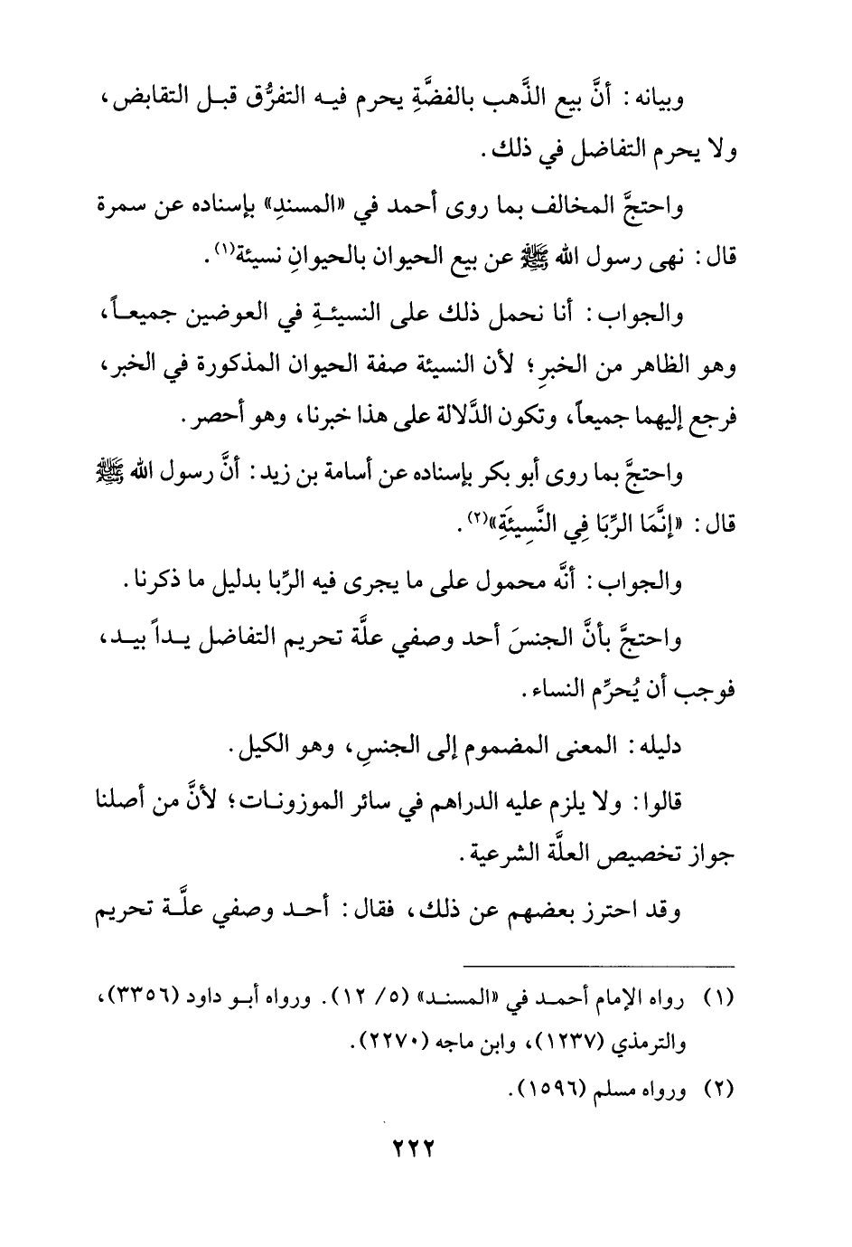 والجواب: أنا نحمل ذلك على النسيئة في العوضين جميعًا, وهو الظاهر من الخبر؛ لأن النسيئة صفة الحيوان المذكورة في الخبر, فرجع إليهما جميعًا, وتكون الدلالة على هذا خبرنا, وهو أحصر.