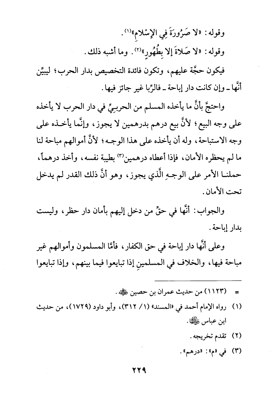 فيكون حجة عليهم, وتكون فائدة التخصيص بدار الحرب؛ ليبين أنها- وإن ما يأخذه المسلم من الحربي في دار الحرب لا يأخذه على وجه البيع؛ لأن بيع درهم بدرهمين لا يجوز, وإنما يأخذه على وجه الاستباحة, وله أن يأخذه على هذا الوجه؛ لأن أموالهم مباحة لنا ما لم يحظره الأمان, فإذا أعطاه درهمين بطيبة نفسه, وأخذ درهمًا, حملنا الأمر على الوجه الذي يجوز, وهو أن ذلك القدر لم يدخل تحت الأمان.