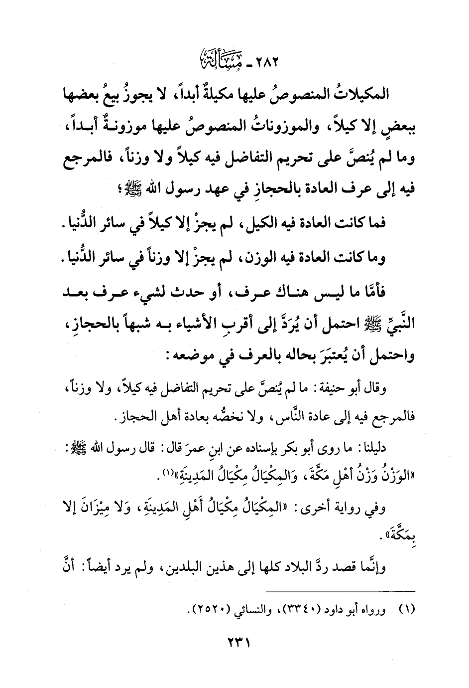 المكيلات المنصوص عليها مكيلة أبدًا, لا يجوز بيع بعضها ببعض إلا كيلًا, والموزونات المنصوص عليها موزونة أبدًا, وما لم ينص على تحريم التفاضل فيه كيلًا ولا وزنًا, فالمرجع فيه إلى عرف العادة بالحجاز في عهد رسول الله - صلى الله عليه وسلم -؛ فما كانت العادة فيه الكيل, لم يجز إلا كيلًا في سائر الدنيا.