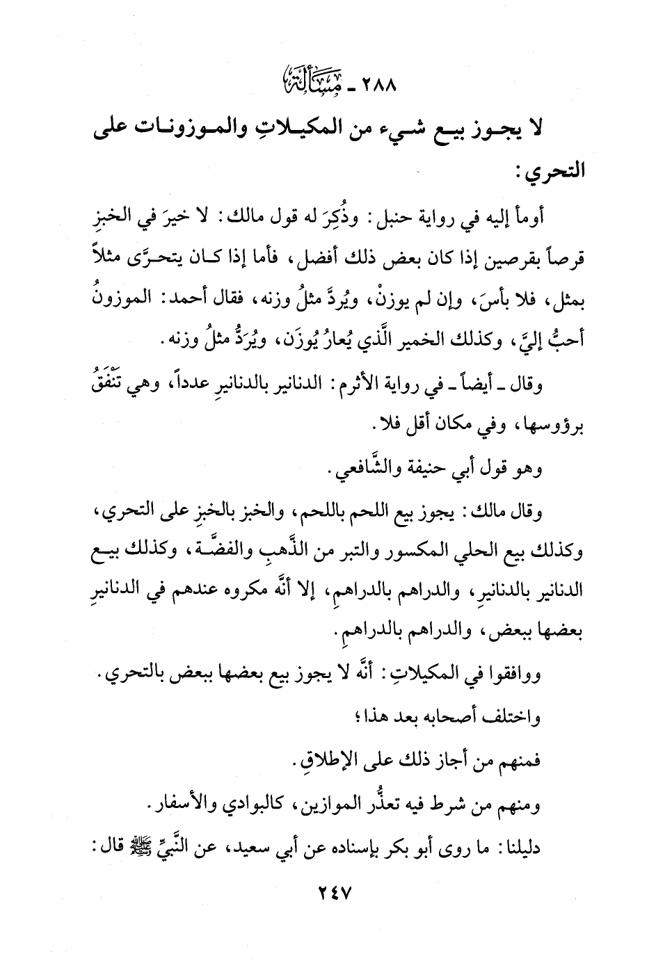 وقال مالك: يجوز بيع اللحم باللحم, والخبز بالخبز على التحري, وكذلك بيع الحلي المكسور والتبر من الذهب والفضة, وكذلك بيع الدنانير بالدنانير, والدراهم بالدراهم, إلا أنه مكروه عندهم في الدنانير بعضها ببعض, والدراهم بالدراهم.