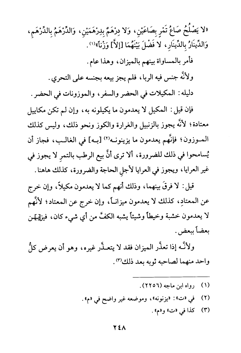 دليله: المكيلات في الحضر والسفر, والموزونات في الحضر.