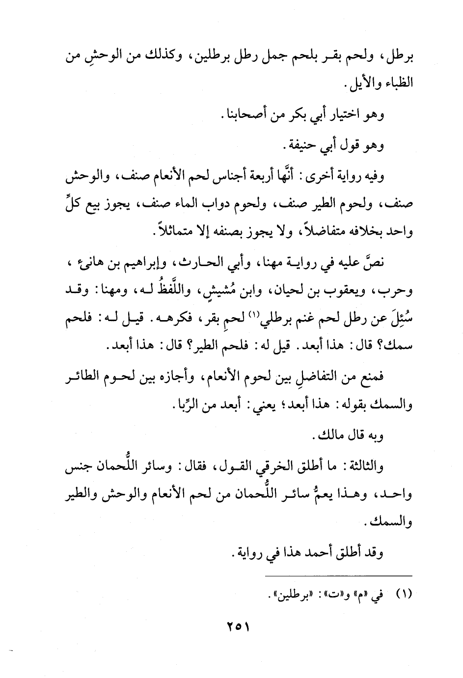 نص عليه في رواية مهنا, وأبي الحارث, وإبراهيم بن هانئ, وحرب, ويعقوب بن لحيان, وابن مشيشٍ, واللفظ له, ومهنا: وقد سئل عن رطل لحم غنم برطلي لحم بقر, فكرهه. قيل له: فلحم سمك؟ قال: هذا أبعد. قيل له: فلحم الطير؟ قال: هذا أبعد.