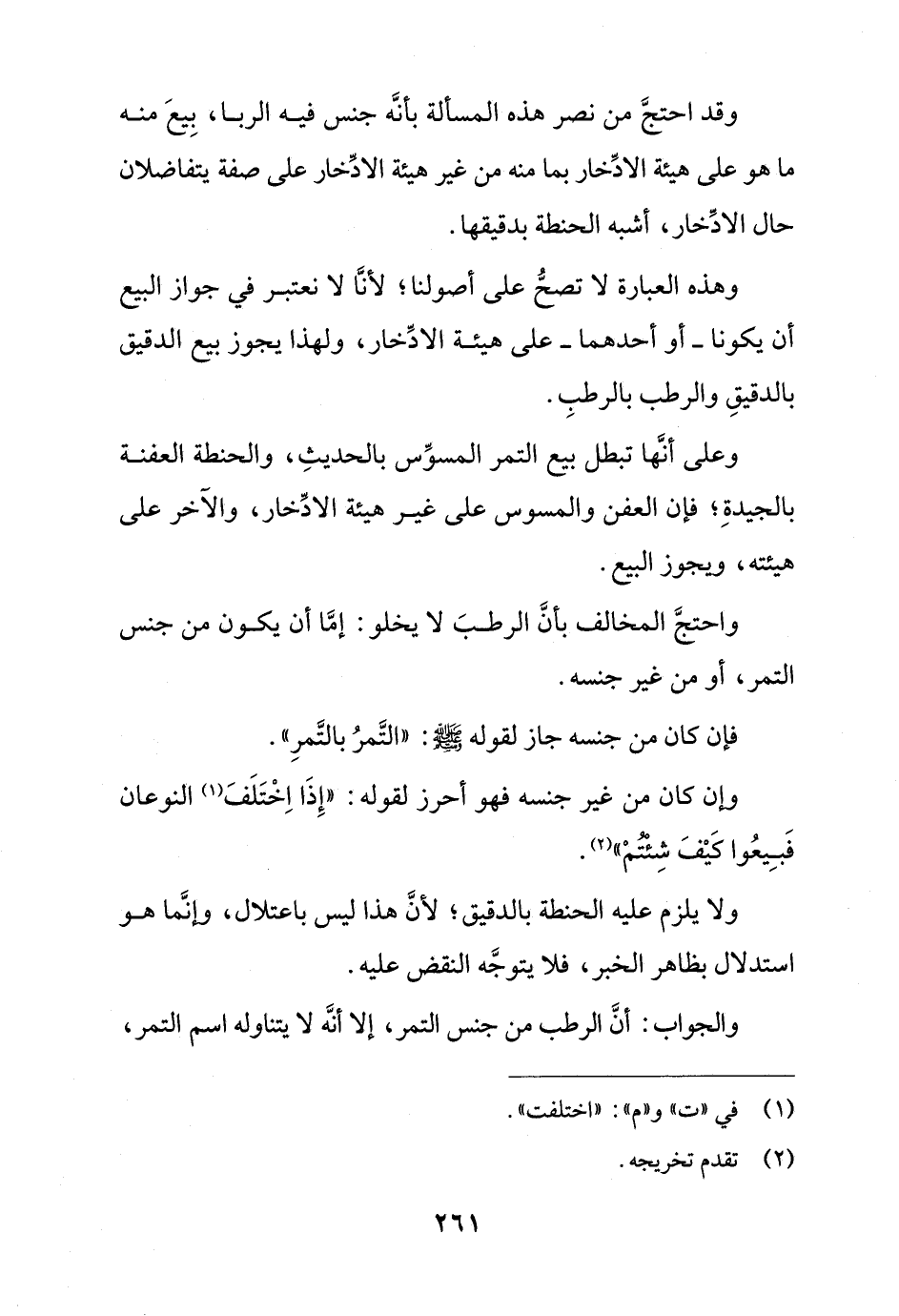 وقد احتجَّ من نصر هذه المسألة بأنه جنس فيه الربا, بيع منه ما هو على هيئة الادخار بما منه من غير هيئة الادخار على صفة يتفاضلان حال الادخار, أشبه الحنطة بدقيقها.