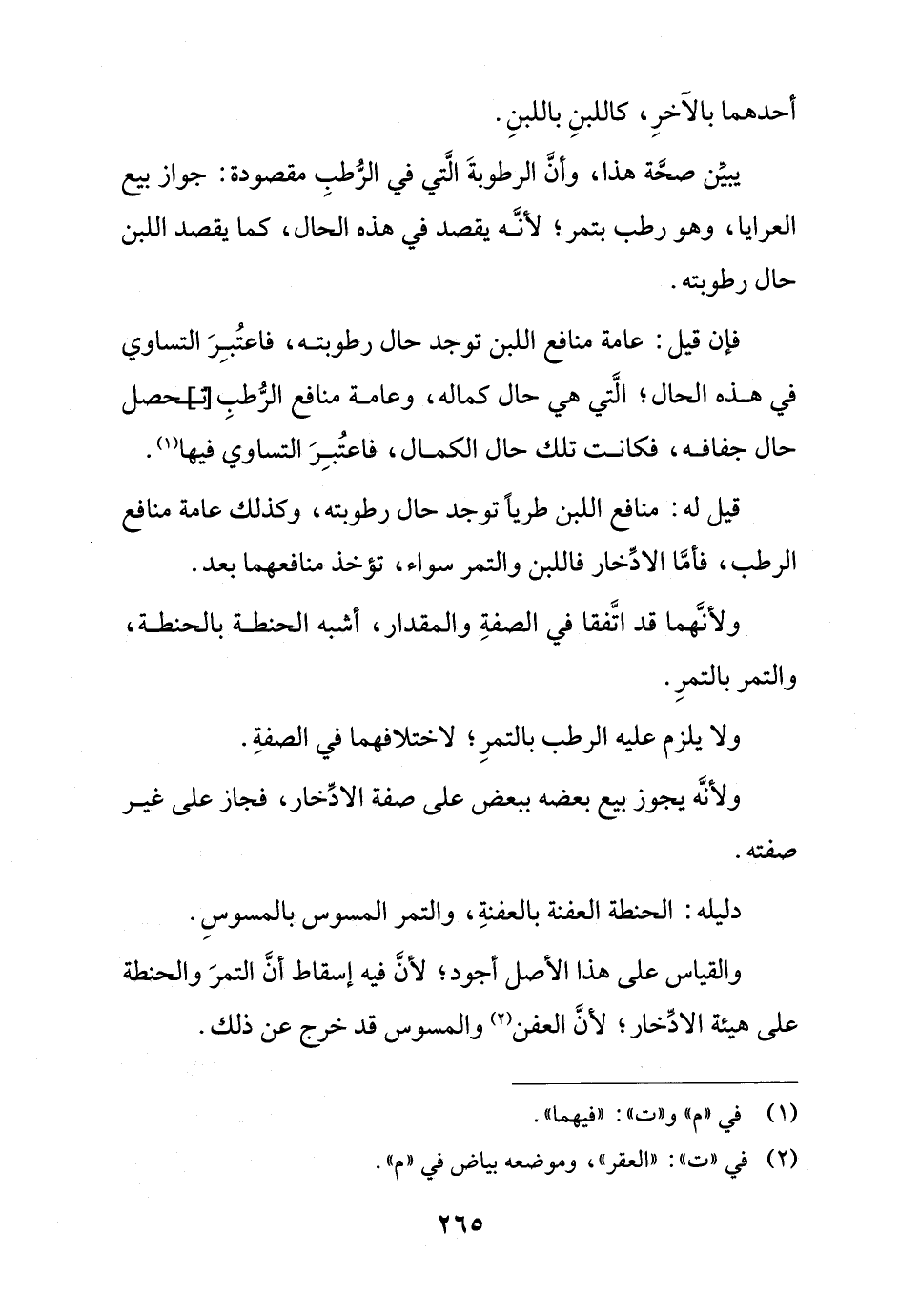 فإن قيل: عامة منافع اللبن توجد حال رطوبته, فاعتبر التساوي في هذه الحال؛ التي هي حال كماله, وعامة منافع الرطب تحصل حال جفافه, فكانت تلك حال الكمال, فاعتبر التساوي فيها.