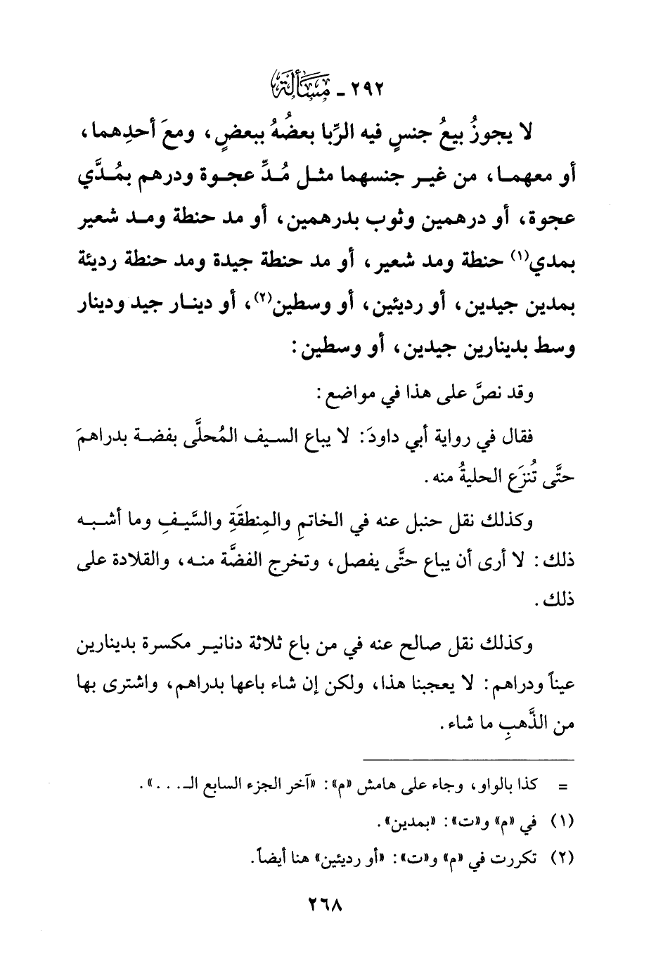 لا يجوز بيع جنس فيه الربا بعضه ببعض, ومع أحدهما, أو معهما, من غير جنسهما مثل مد عجوة ودرهم بمدي عجوة, أو درهمين وثوب بدرهمين, أو مد حنطة ومد شعير بمدي حنطة ومد شعير, أو مد حنطة جيدة ومد حنطة رديئة بمدين جيدين, أو رديئين, أو وسطين, أو دينار جيد ودينار وسط بدينارين جيدين, أو وسطين: