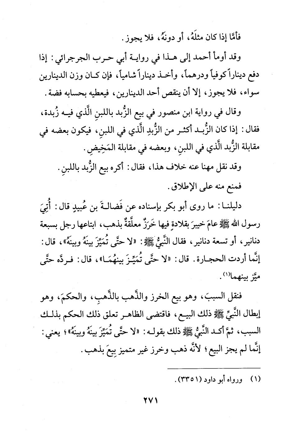 وقال في رواية ابن منصور في بيع الزبد باللبن الذي فيه زبدة, فقال: إذا كان الزبد أكثر من الزبد الذي في اللبن, فيكون بعضه في مقابلة الزبد الذي في اللبن, وبعضه في مقابلة المخيض.