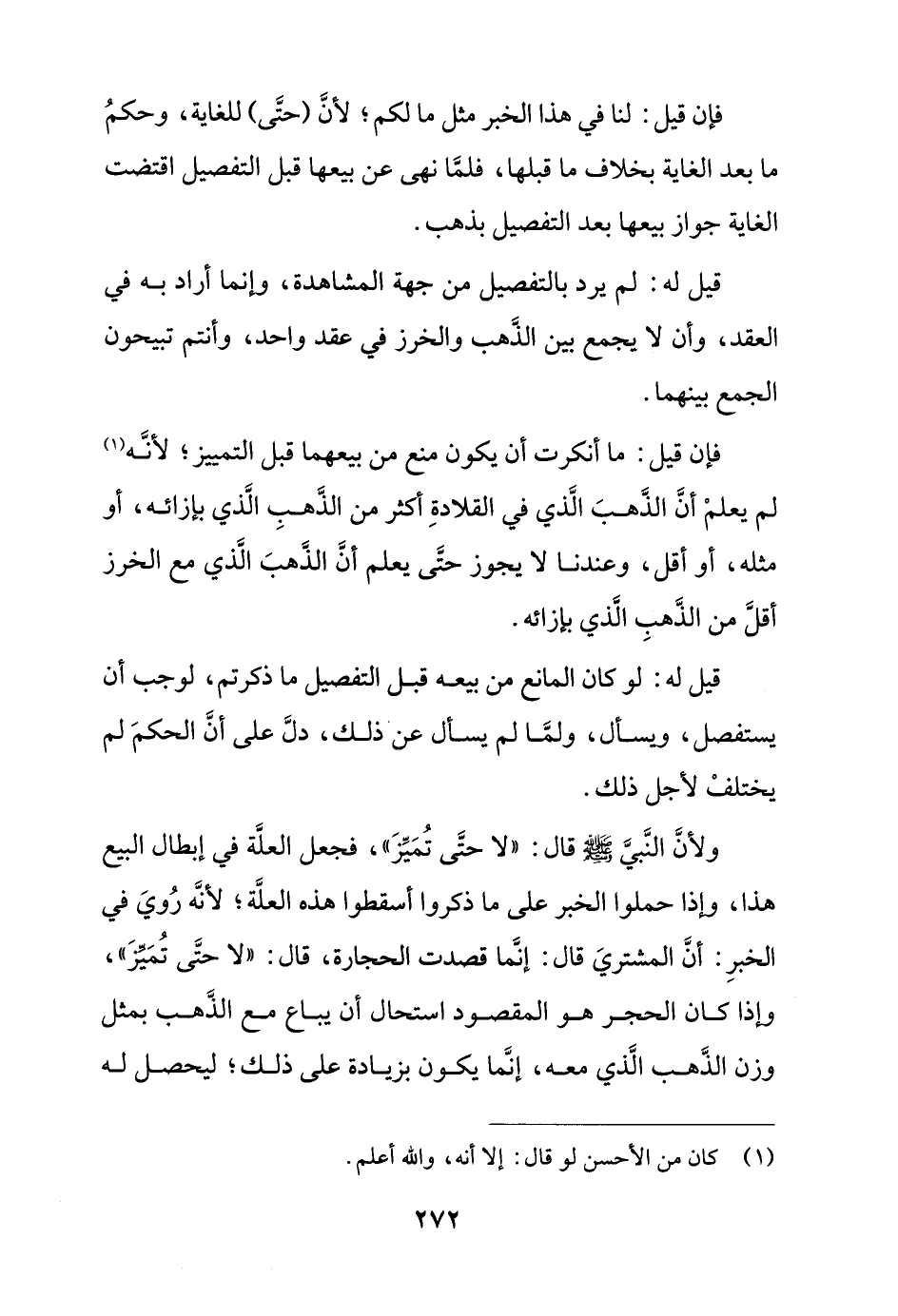 قيل له: لو كان المانع من بيعه قبل التفصيل ما ذكرتم, لوجب أن يستفصل, ويسأل, ولما لم يسأل عن ذلك, دل على أن الحكم لم يختلف لأجل ذلك.