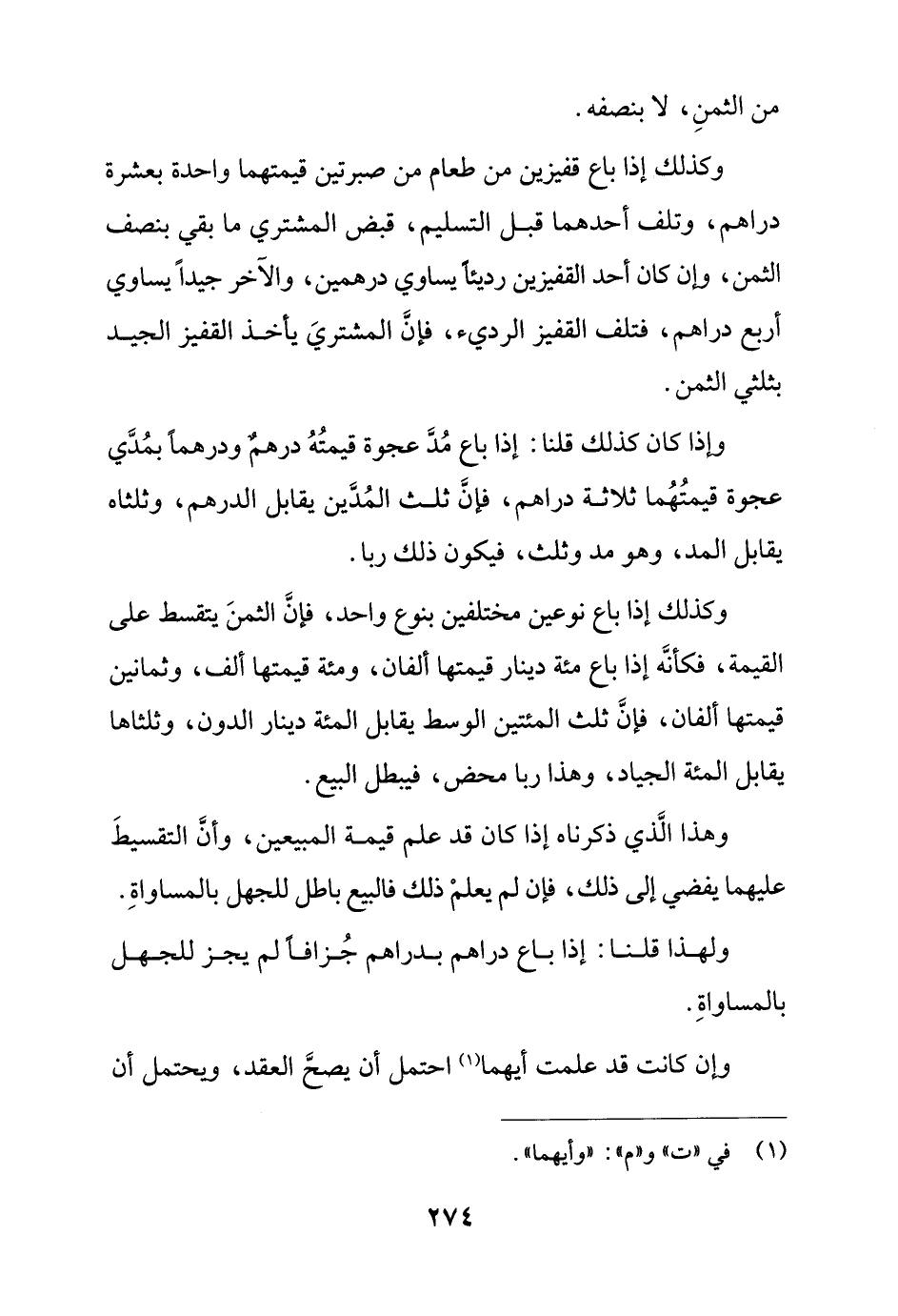 وكذلك إذا باع قفيزين من طعام من صبرتين قيمتهما واحدة بعشرة دراهم, وتلف أحدهما قبل التسليم, قبض المشتري ما بقي بنصف الثمن, وإن كان أحد القفيزين رديئًا يساوي درهمين, والآخر جيدًا يساوي أربع دراهم, فتلف القفير الرديء, فإن المشتري يأخذ القفيز الجيد بثلثي الثمن.
