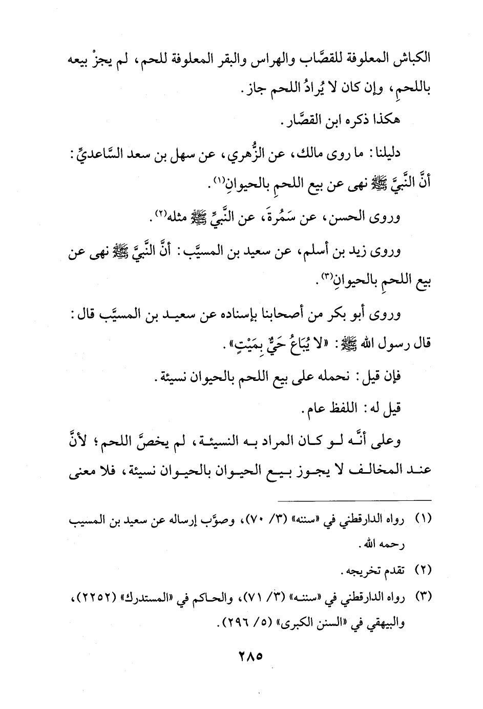 وروى زيد بن أسلم, عن سعيد بن المسيب: أن النبي - صلى الله عليه وسلم - نهى عن بيع اللحم بالحيوان.