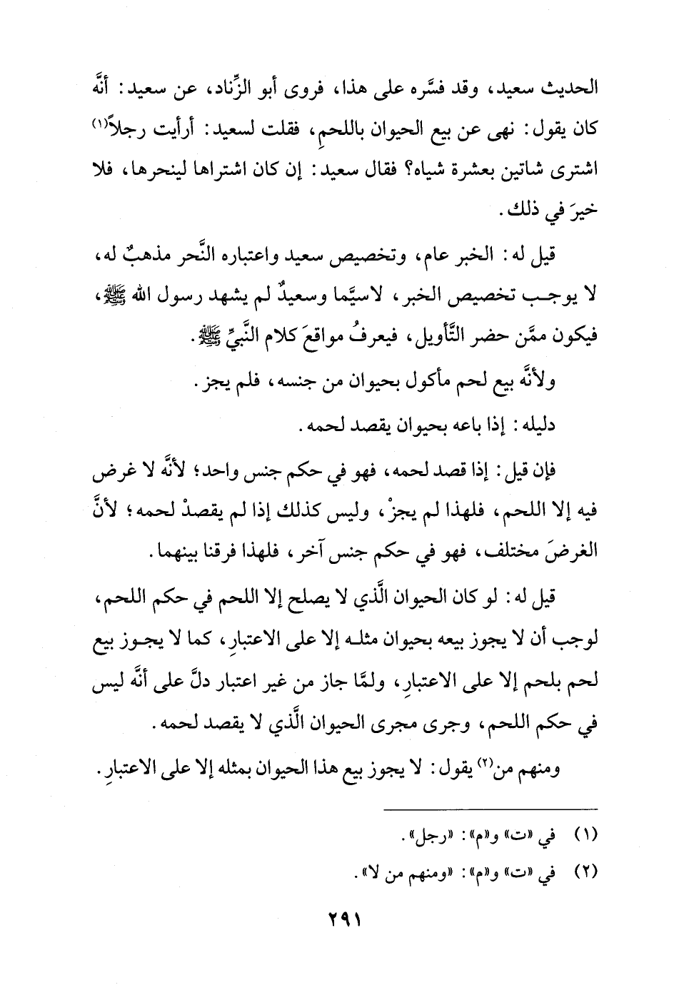 الحديث سعيد, وقد فسره على هذا, فروى أبو الزناد, عن سعيد: أنه كان يقول: نهى عن بيع الحيوان باللحم, فقلت لسعيد: أرأيت رجلًا اشترى شاتين بعشرة شياه؟ فقال سعيد: إن كان اشتراها لينحرها, فلا خير في ذلك.