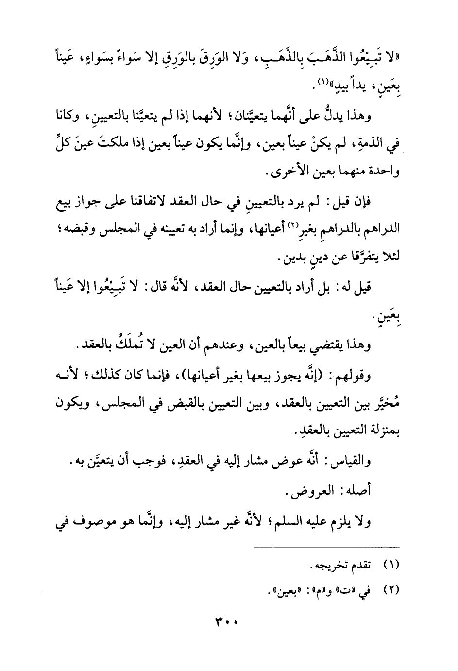 وهذا يدل على أنهما يتعينان؛ لأنهما إذا لم يتعينا بالتعيين, وكانا في الذمة, لم يكن عينًا بعين, وإنما يكون عينًا بعين إذا ملكت عين كل واحدة منهما بعين الأخرى.