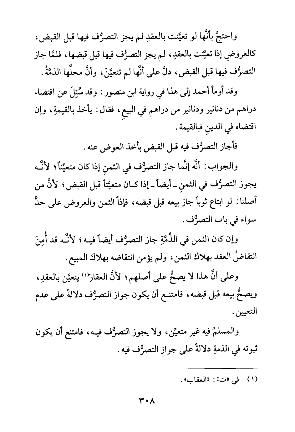 والجواب: أنه إنما جاز التصرف في الثمن إذا كان متعينًا؛ لأنه يجوز التصرف في الثمن- أيضًا- إذا كان متعينًا قبل القبض؛ لأن من أصلنا: لو ابتاع ثوبًا جاز بيعه قبل قبضه، فإذًا الثمن والعروض على حد سواء في باب التصرف.