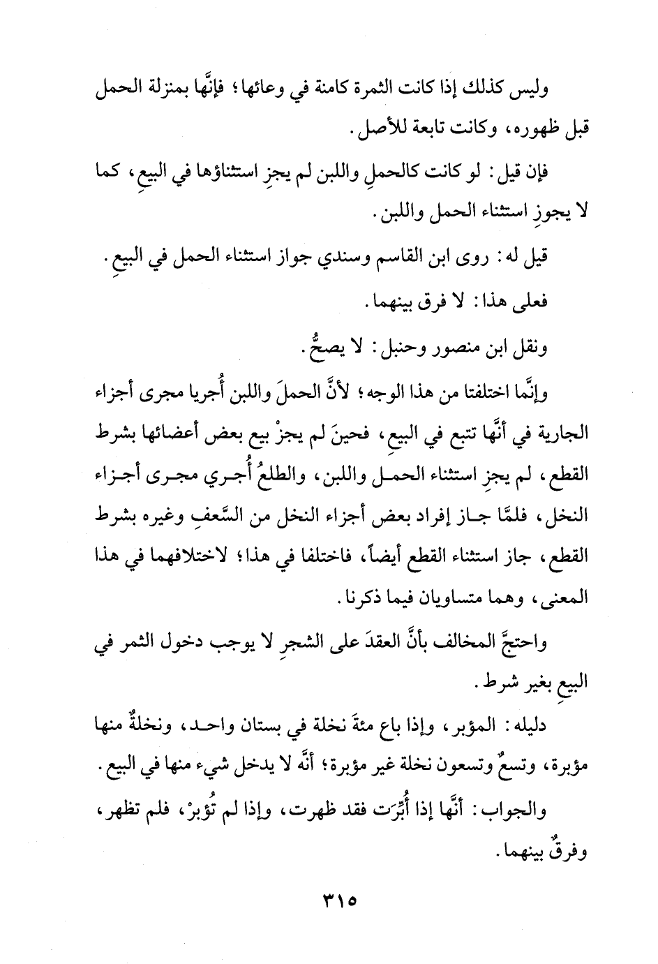 وإنما اختلفتا من هذا الوجه؛ لأن الحمل واللبن أجريا مجرى أجزاء الجارية في أنها تتبع في البيع، فحين لم يجز بيع بعض أعضائها بشرط القطع، لم يجز استثناء الحمل واللبن، والطلع أجري مجرى أجزاء النخل، فلما جاز إفراد بعض أجزاء النخل من السعف وغيره بشرط القطع، جاز استثناء القطع أيضًا، فاختلفا في هذا؛ لاختلافهما في هذا المعنى، وهما متساويان فيما ذكرنا.