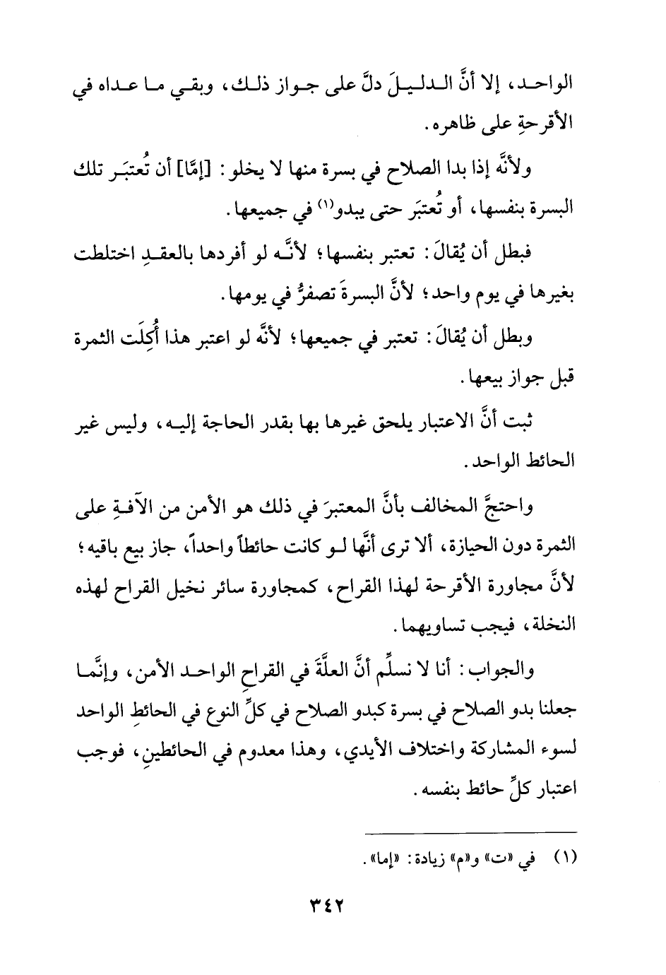 واحتج المخالف بأن المعتبر في ذلك هو الأمن من الآفة على الثمرة دون الحيازة، ألا ترى أنها لو كانت حائطًا واحدًا، جاز بيع باقيه؛ لأن مجاورة الأقرحة لهذا القراح، كمجاورة سائر نخيل القراح لهذه النخلة، فيجب تساويهما.
