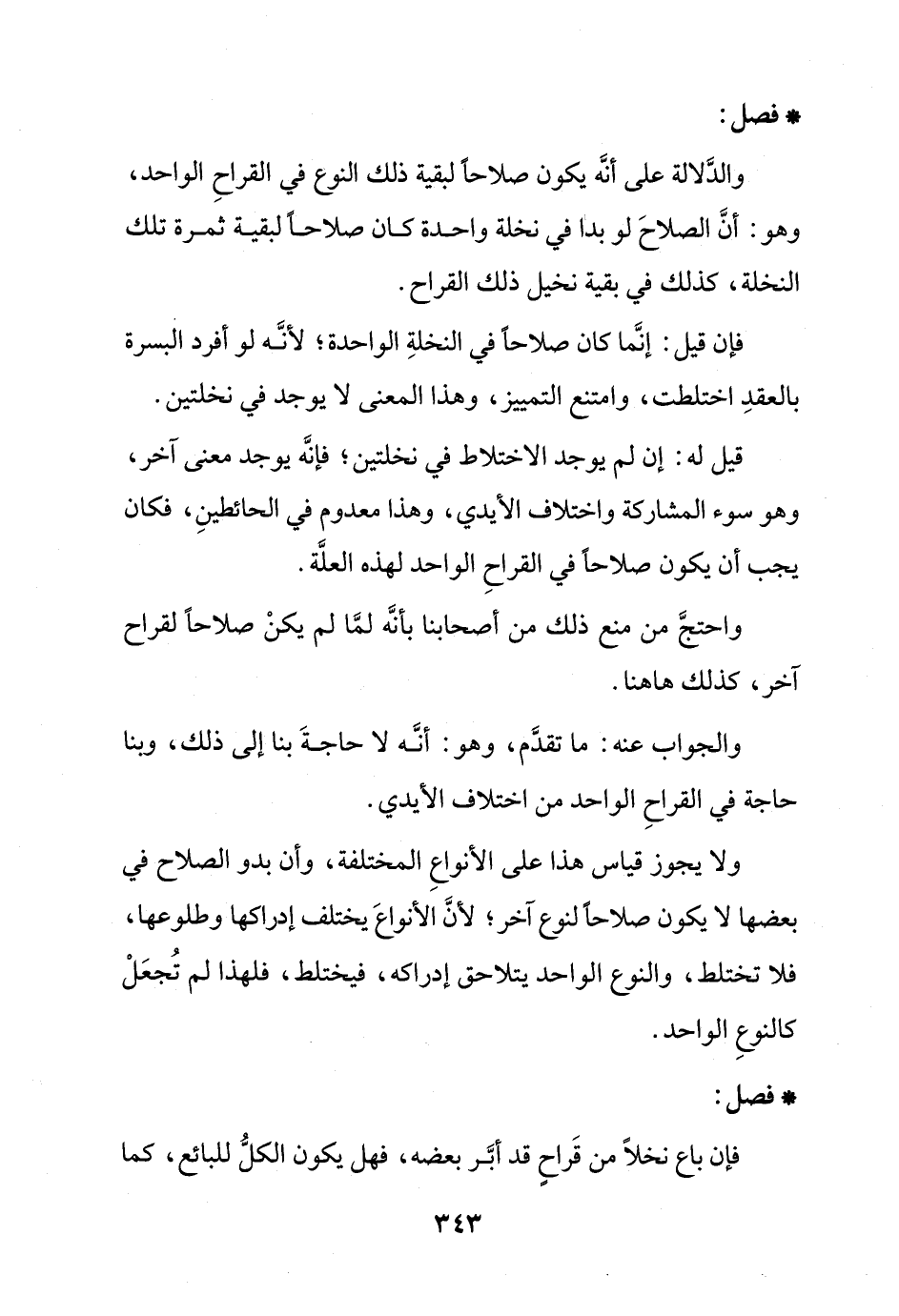 ولا يجوز قياس هذا على الأنواع المختلفة، وأن بدو الصلاح في بعضها لا يكون صلاحًا لنوع آخر؛ لأن الأنواع يختلف إدراكها وطلوعها، فلا تختلط، والنوع الواحد يتلاحق إدراكه، فيختلط، فلهذا لم تجعل كالنوع الواحد.